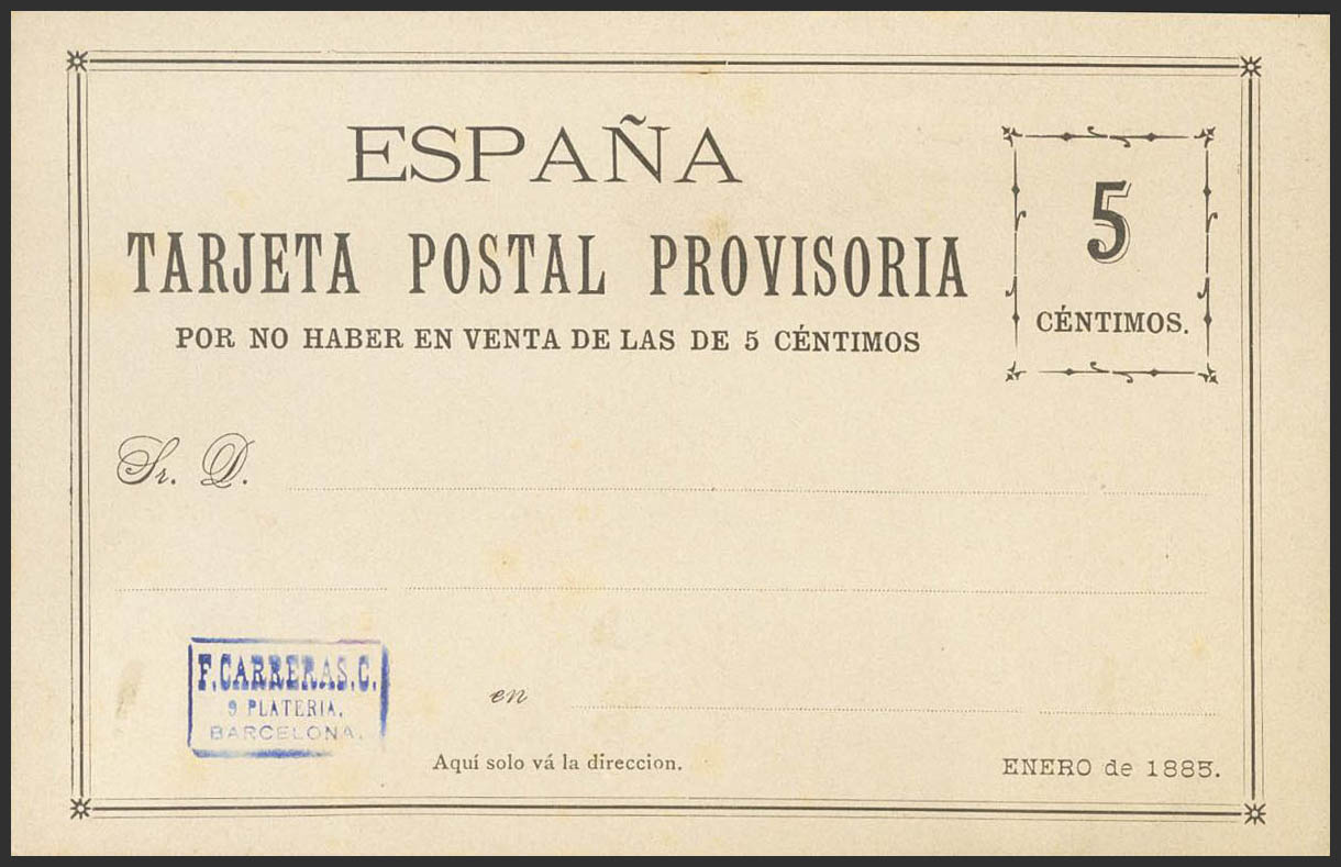 (★) EPCC2. 1885. 5 cts negro. TARJETA POSTAL PROVISORIA DE CARRERAS CANDI (con marquilla en violeta). MAGNIFICA.