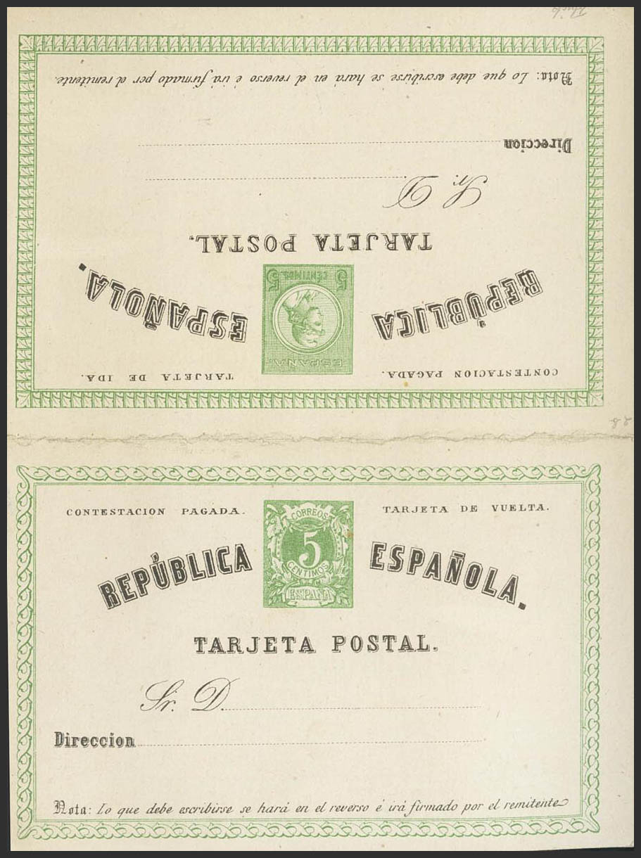 (★) EP2. 1873. 5 cts + 5 cts verde sobre Tarjeta Entero Postal, de ida y vuelta. MAGNIFICA. Edifil 2020: 102 Euros