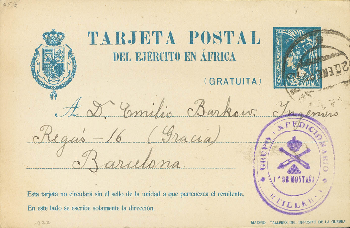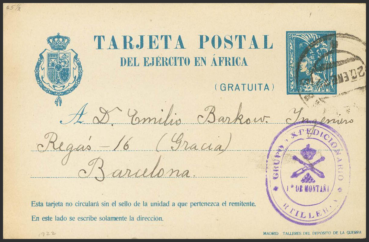 EPM2A. 1922. Sin valor, azul sobre Tarjeta Entero Postal Militar de ZELUAN a BARCELONA. En el frente marca GRUPO EXPEDICIONARIO / 1ª DE MONTAÑA / ARTILLERIA, en violeta. MAGNIFICA Y RARA.
