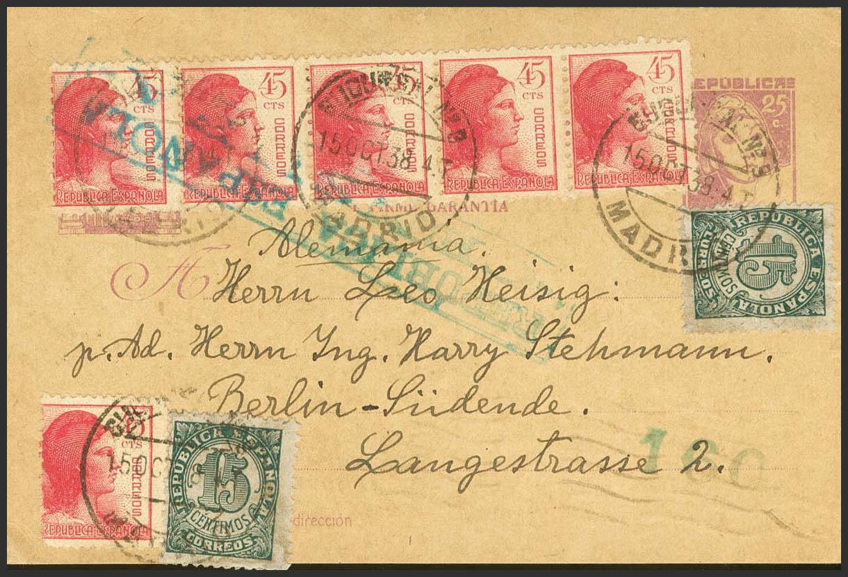 EP79, 747(2), 752(6). 1938. 25 cts lila sobre Tarjeta Entero Postal de MADRID a BERLIN (ALEMANIA), con franqueo complementario de 15 cts verde, dos sellos y 45 cts rosa, seis sellos. MAGNIFICA Y RARA.