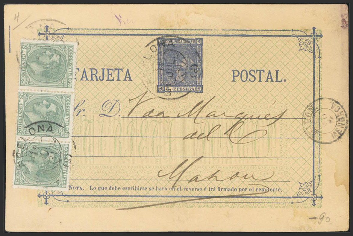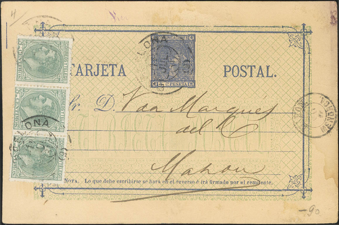 EP8, 201(3). 1881. 5 cts ultramar sobre Tarjeta Entero Postal de BARCELONA a MAHON, con franqueo complementario de 5 cts verde, tira de tres (pliegue vertical). En el frente llegada. MAGNIFICA Y RARO FRANQUEO.