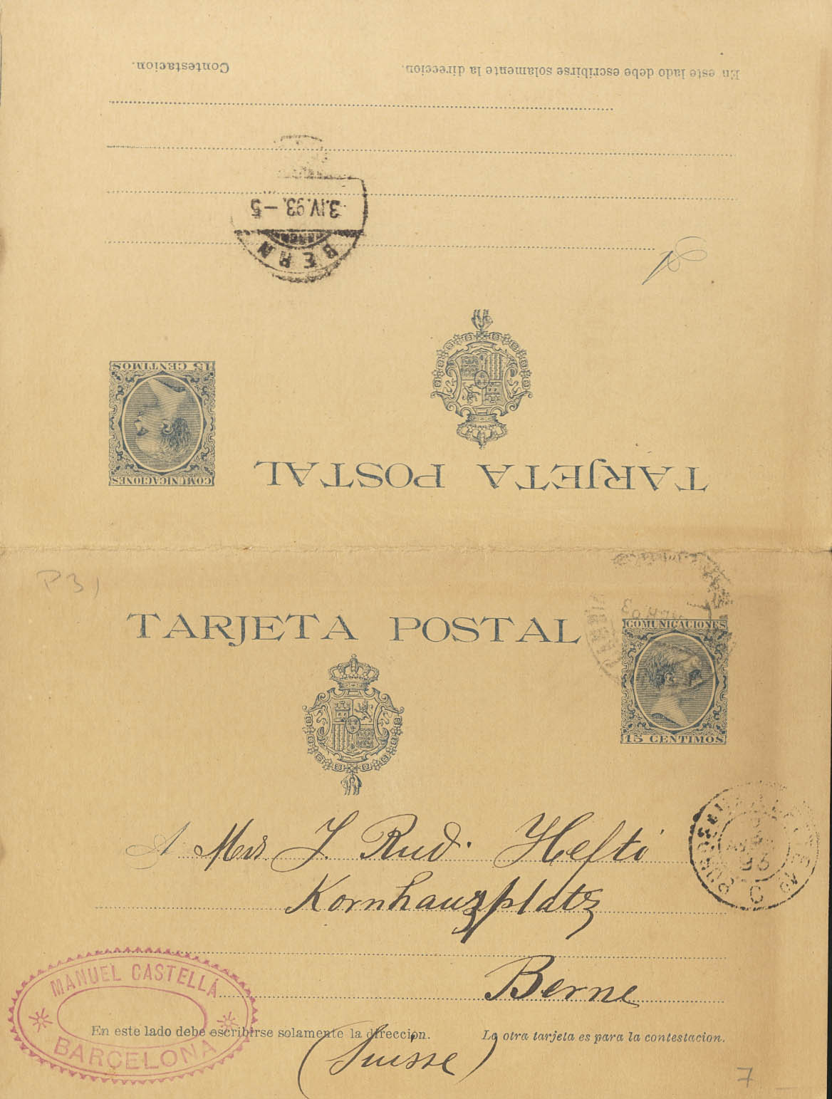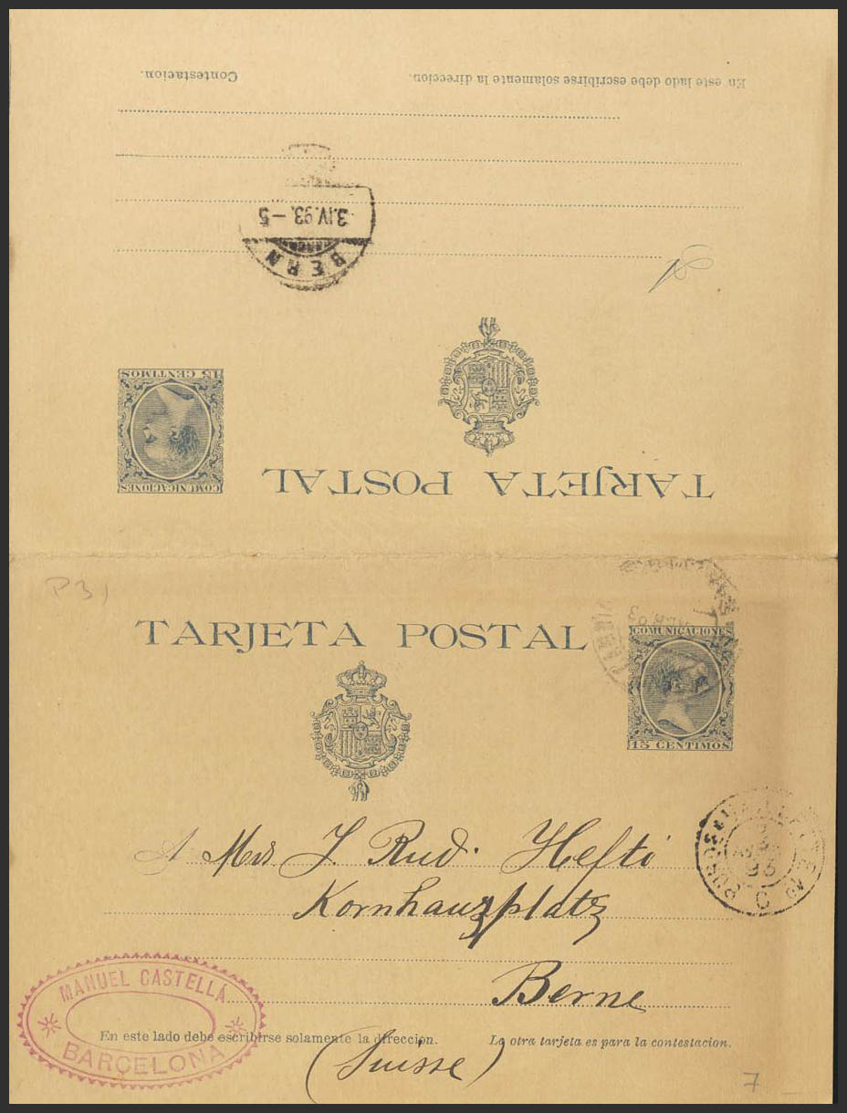 EP28. 1893. 15 cts+15 cts azul sobre Tarjeta Entero Postal (de ida y vuelta), la ida circulada de BARCELONA a BERNA (SUIZA). En el frente tránsito y llegada en la tarjeta de vuelta. MAGNIFICA Y RARA.