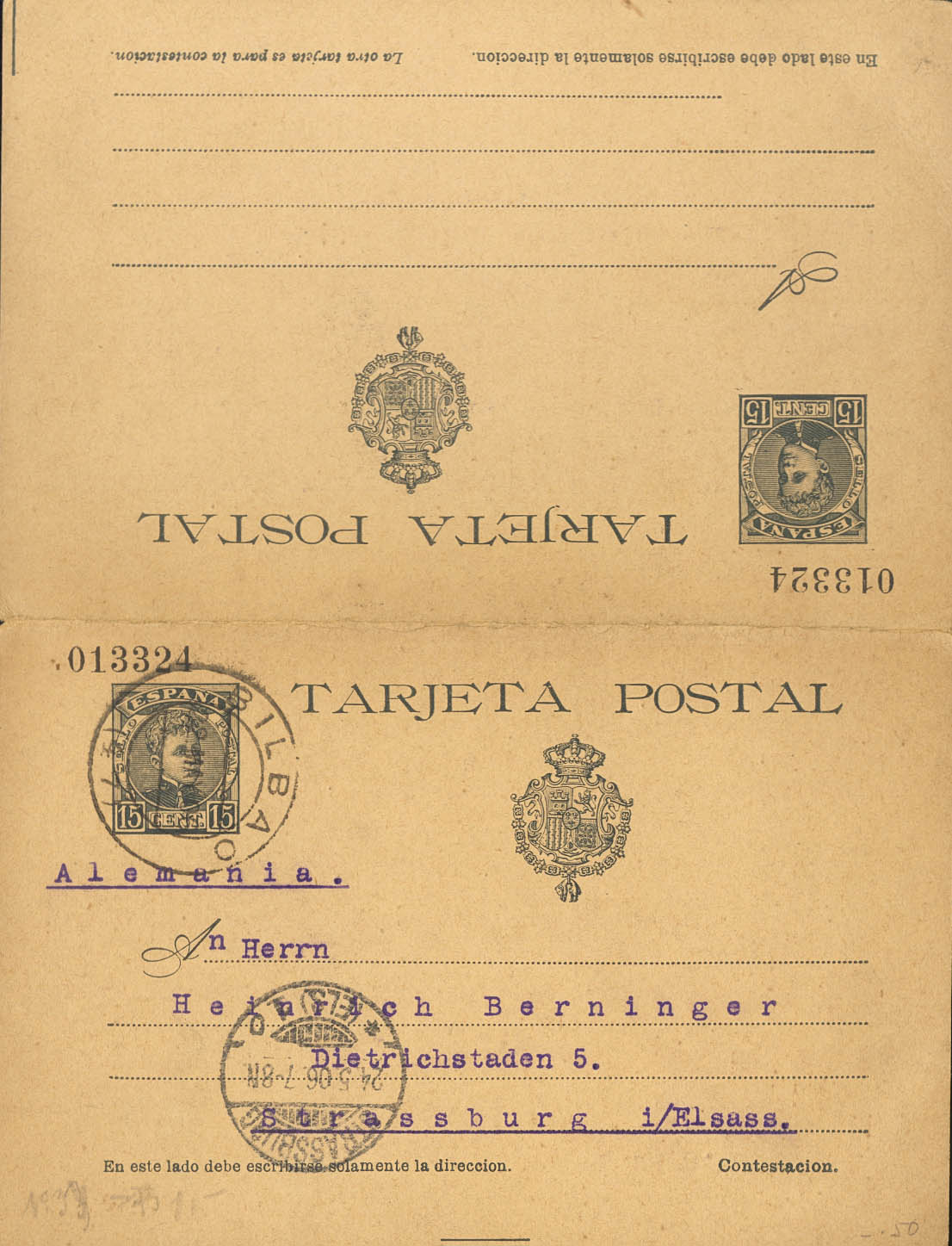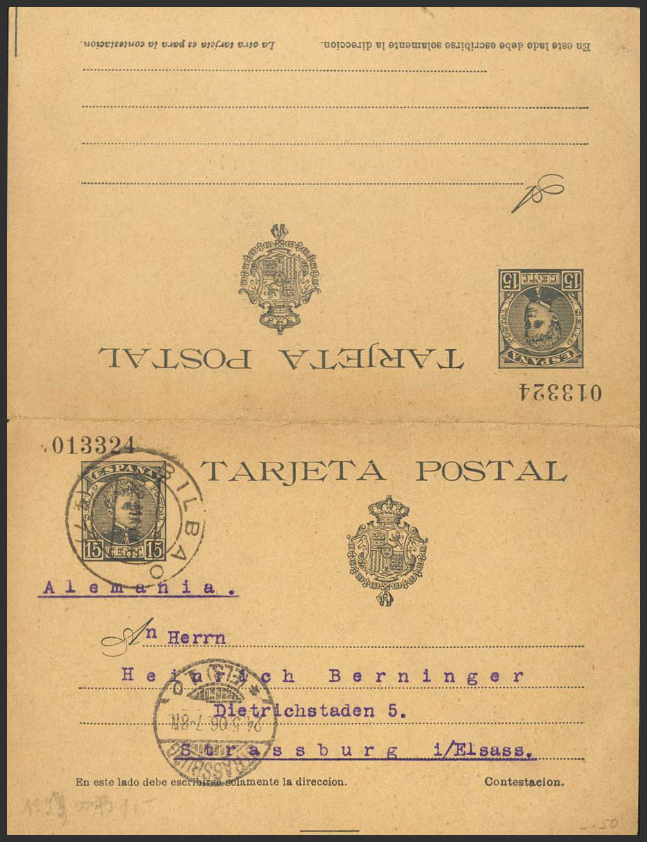 EP38. 1906. 15 cts+15 cts pizarra sobre Tarjeta Entero Postal (de ida y vuelta), la vuelta circulada de BILBAO a ESTRASBURGO (ALSACIA). En el frente llegada. MAGNIFICA Y RARA.