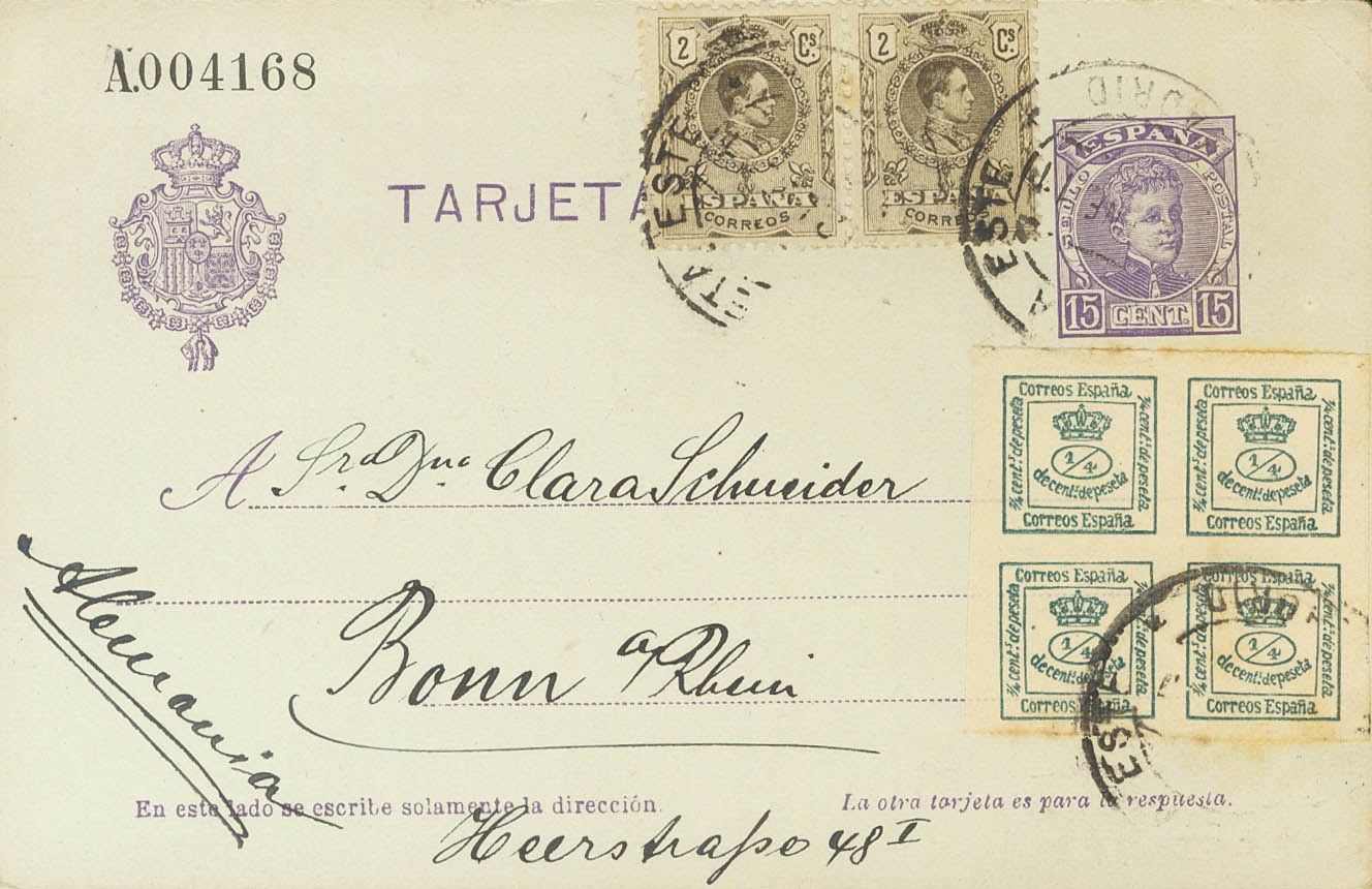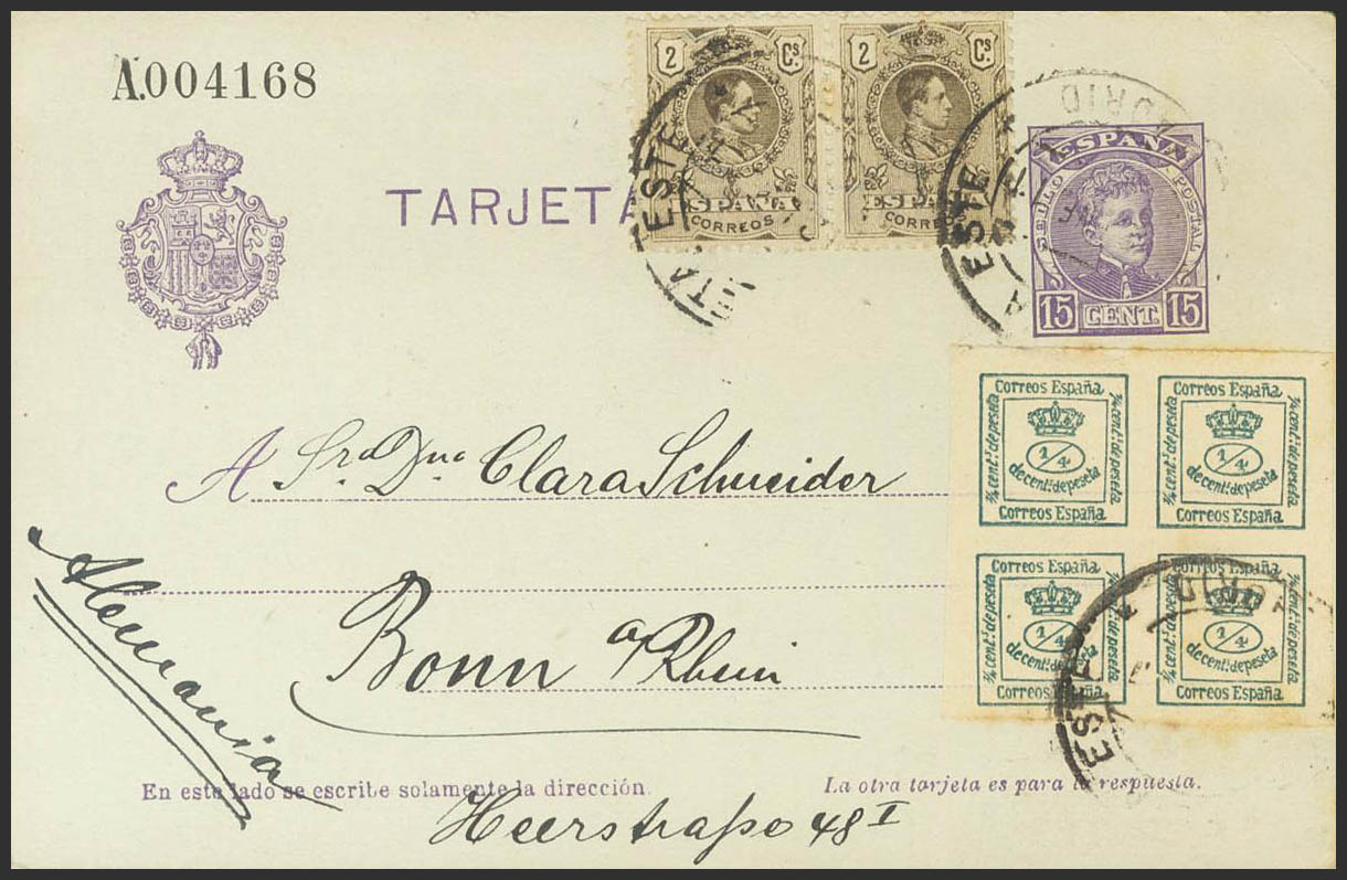 EP46i, 173, 267(2). 1911. 15 cts violeta sobre Tarjeta Entero Postal (de ida) de MADRID a BONN (ALEMANIA), con franqueo complementario de 4/4 cts verde y 2 cts castaño, dos sellos. MAGNIFICA.