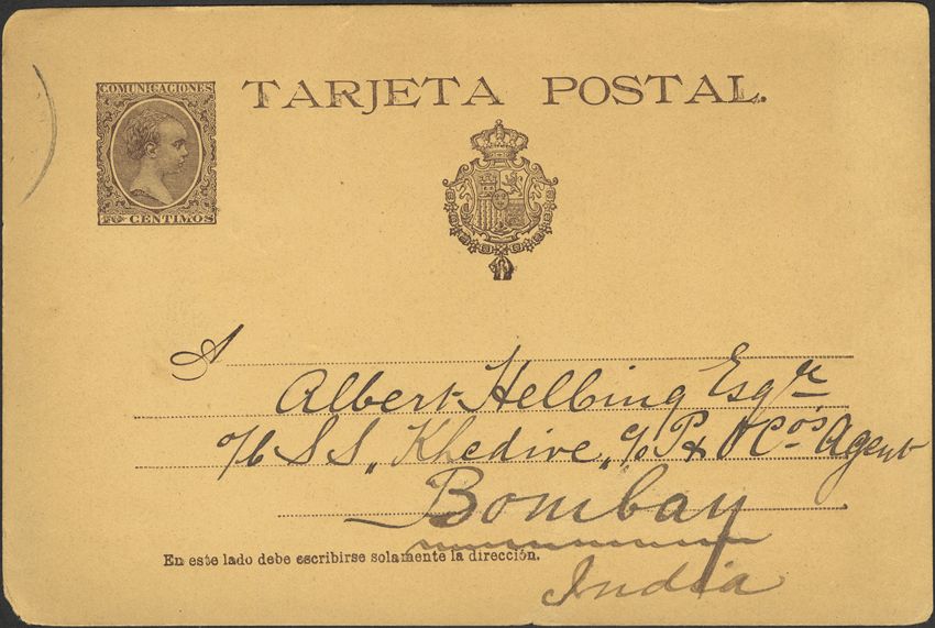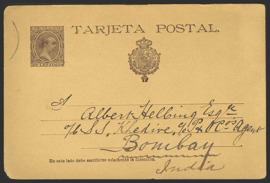 EP27. 1895. 10 cts sobre Tarjeta Entero Postal de VILLAGARCIA a BOMBAY (INDIA). MAGNIFICA Y RARO DESTINO.
