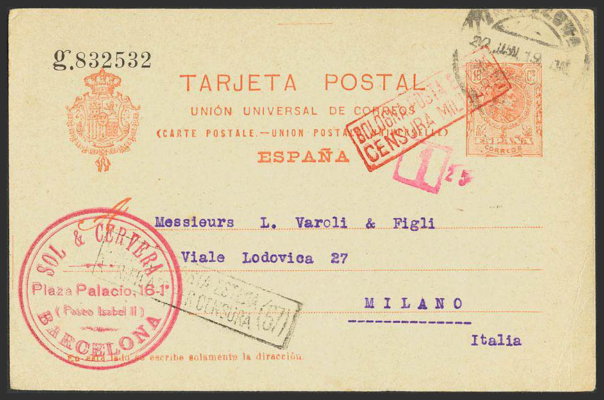 Entero Postal. EP53. Matasello BOLOGNA POSTA ESTAFETA / CENSURA MILITARE. MAGNIFICA.