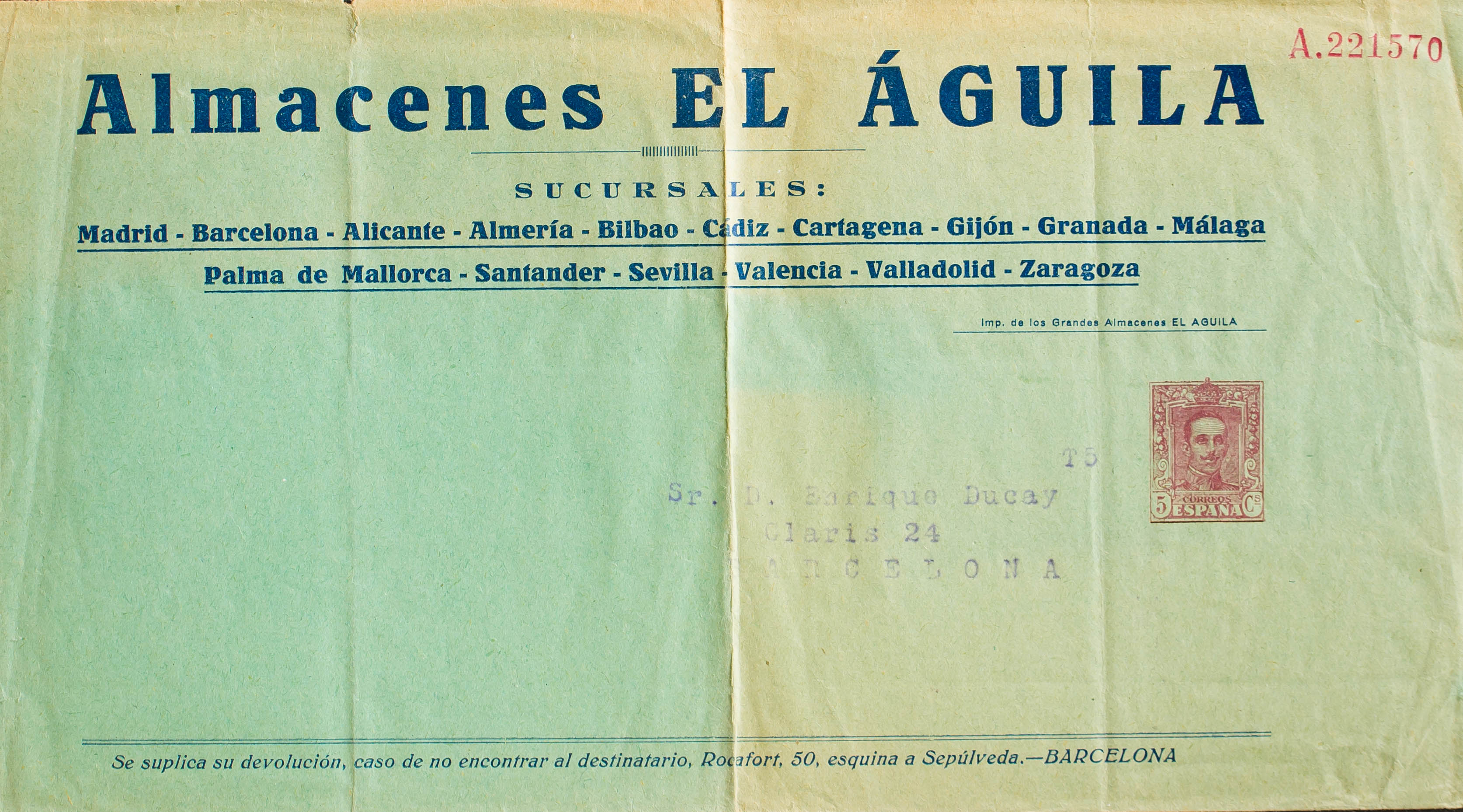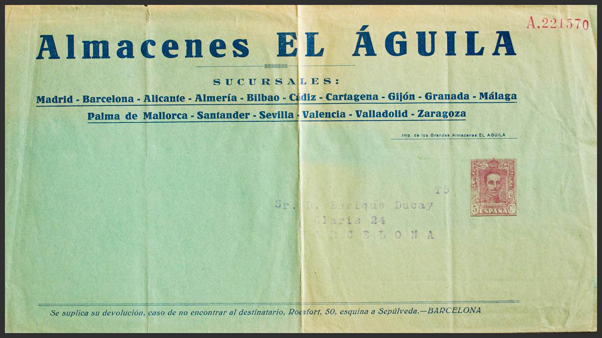 (★) EP647. 1928. 5 cts violeta sobre Entero Postal Privado de ALMACENES EL AGUILA Correo Interior de BARCELONA (conservación habitual). BONITO Y RARO. (Láiz 2000: 200 Euros).
