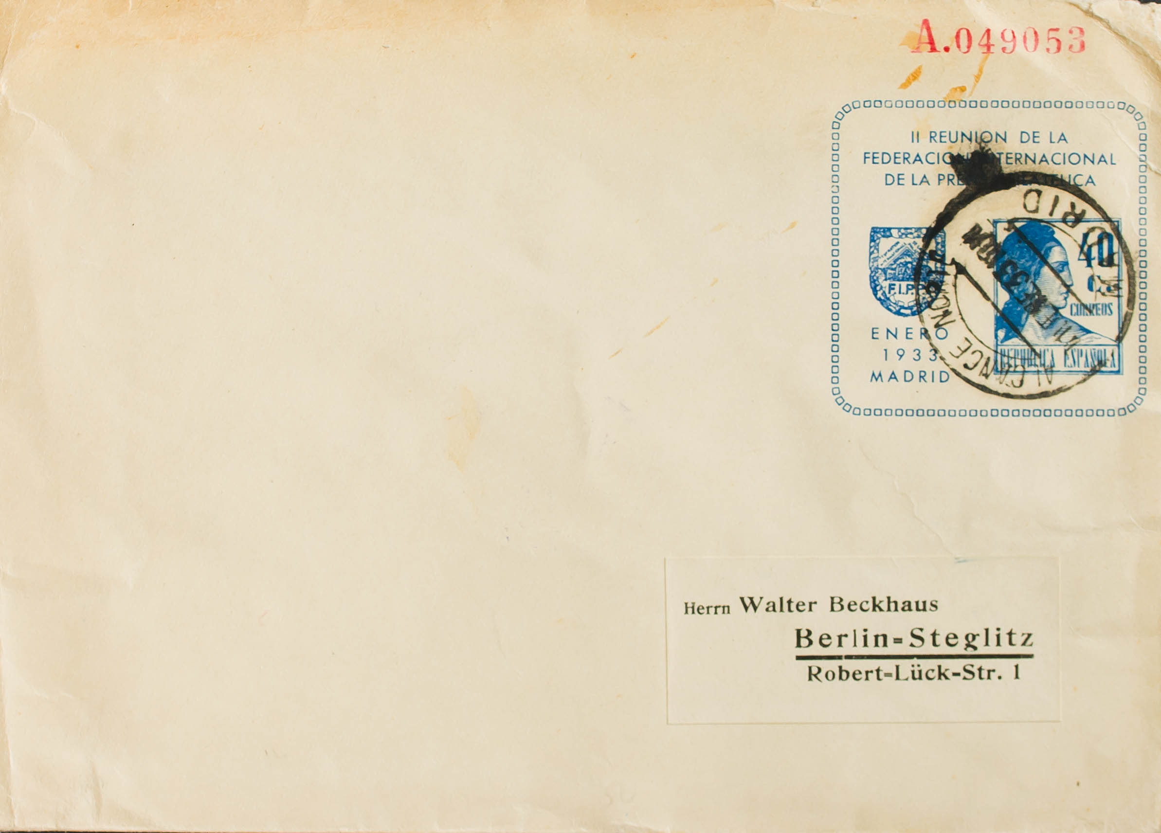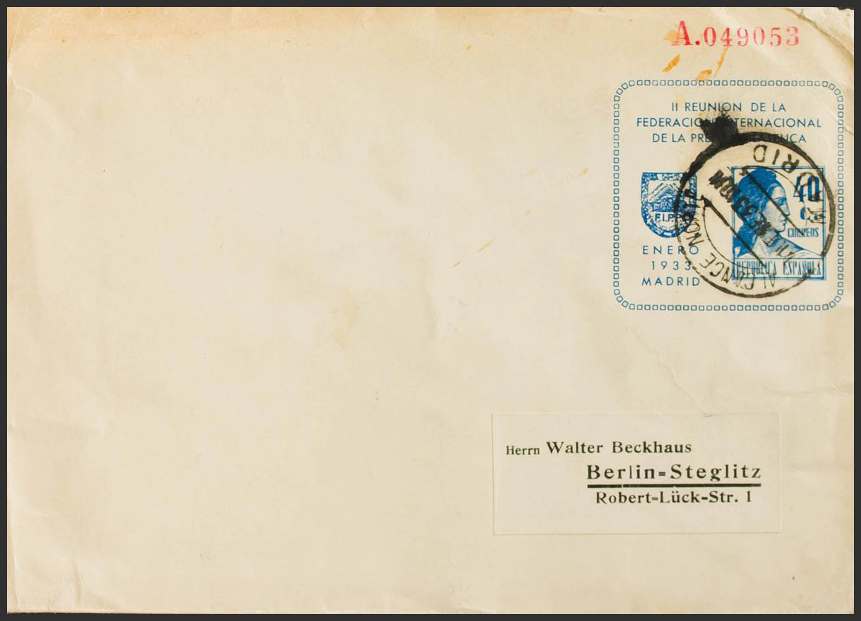 EP1299. 1933. 40 cts azul sobre Entero Postal Privado II REUNION DE LA FEDERACION INTERNACIONAL DE LA PRENSA FILATELICA de MADRID a BERLIN. BONITO. (Láiz 2000: 80 Euros)