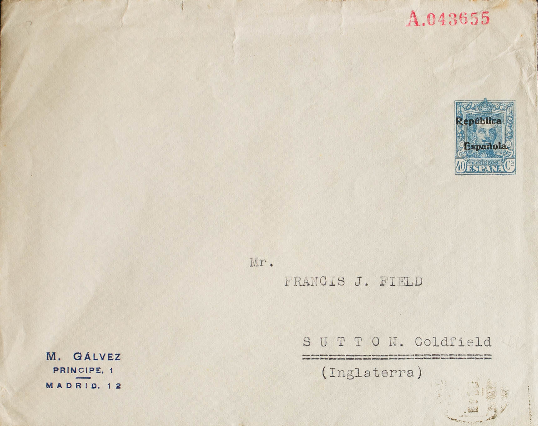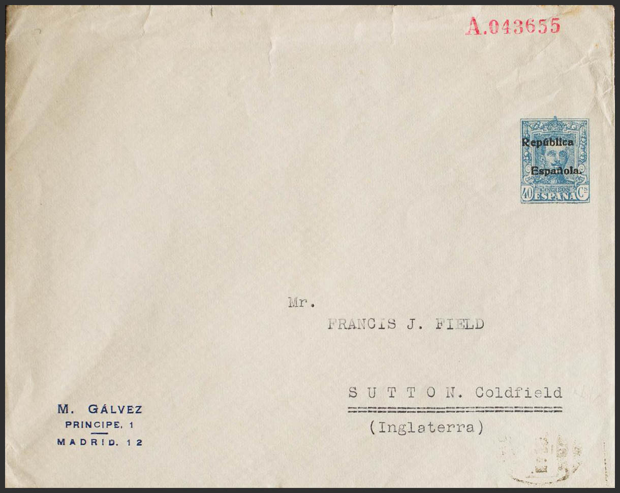 EP968. (1932ca). 40 cts azul sobre Entero Postal Privado M.GALVEZ. MADRID a SUTTON (INGLATERRA). MAGNIFICO.