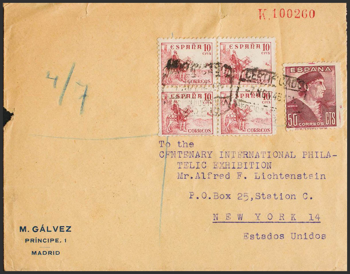 EP1138, 1002, 917(4). 1946. 2 cts oliva sobre Entero Postal Privado M. GALVEZ Certificado de MADRID a NUEVA YORK (U.S.A.), utilizado con sellos de 50 cts carmÃn y 10 cts rosa, bloque de cuatro (ocultando-sustituyendo el sello del Entero Postal de la época de la República). Al dorso llegada. MAGNIFICO Y MUY RARO USO DE UN ENTERO DE LA REPUBLICA EN 1946.