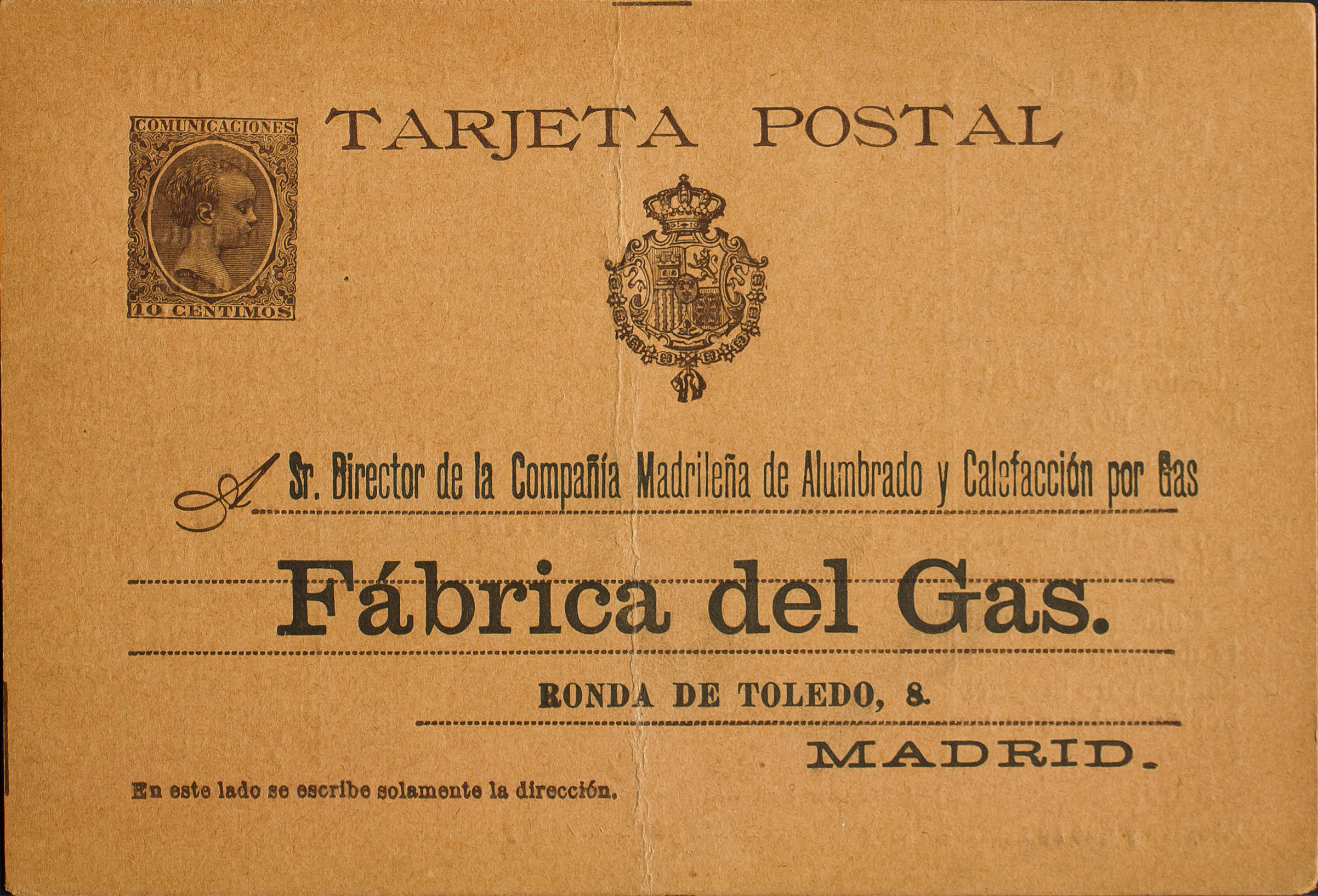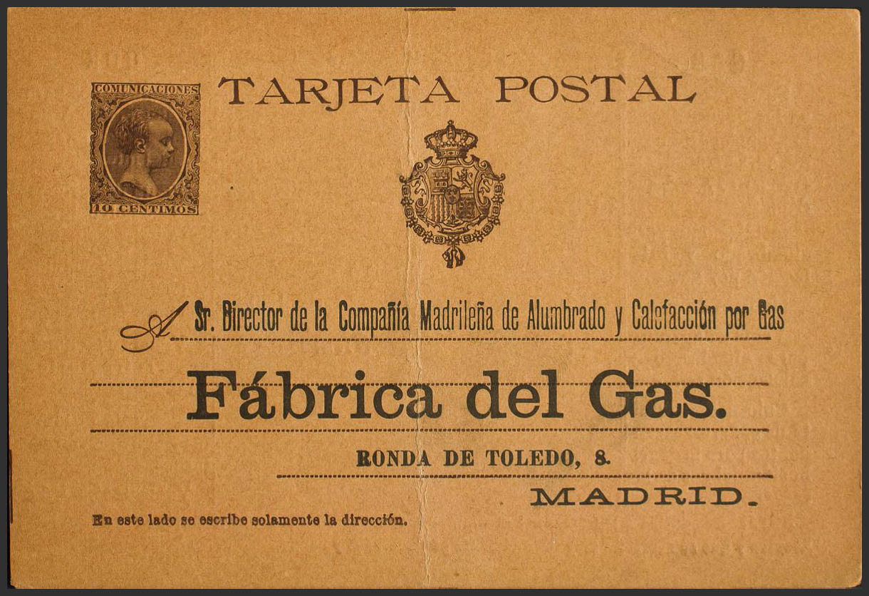 (★) EP36. 1897. 10 cts castaño sobre Tarjeta Entero Postal con Preimpresión Privada FABRICA DEL GAS, en anverso y reverso. MAGNIFICA Y MUY RARA. Edifil 2017: ++178 Euros