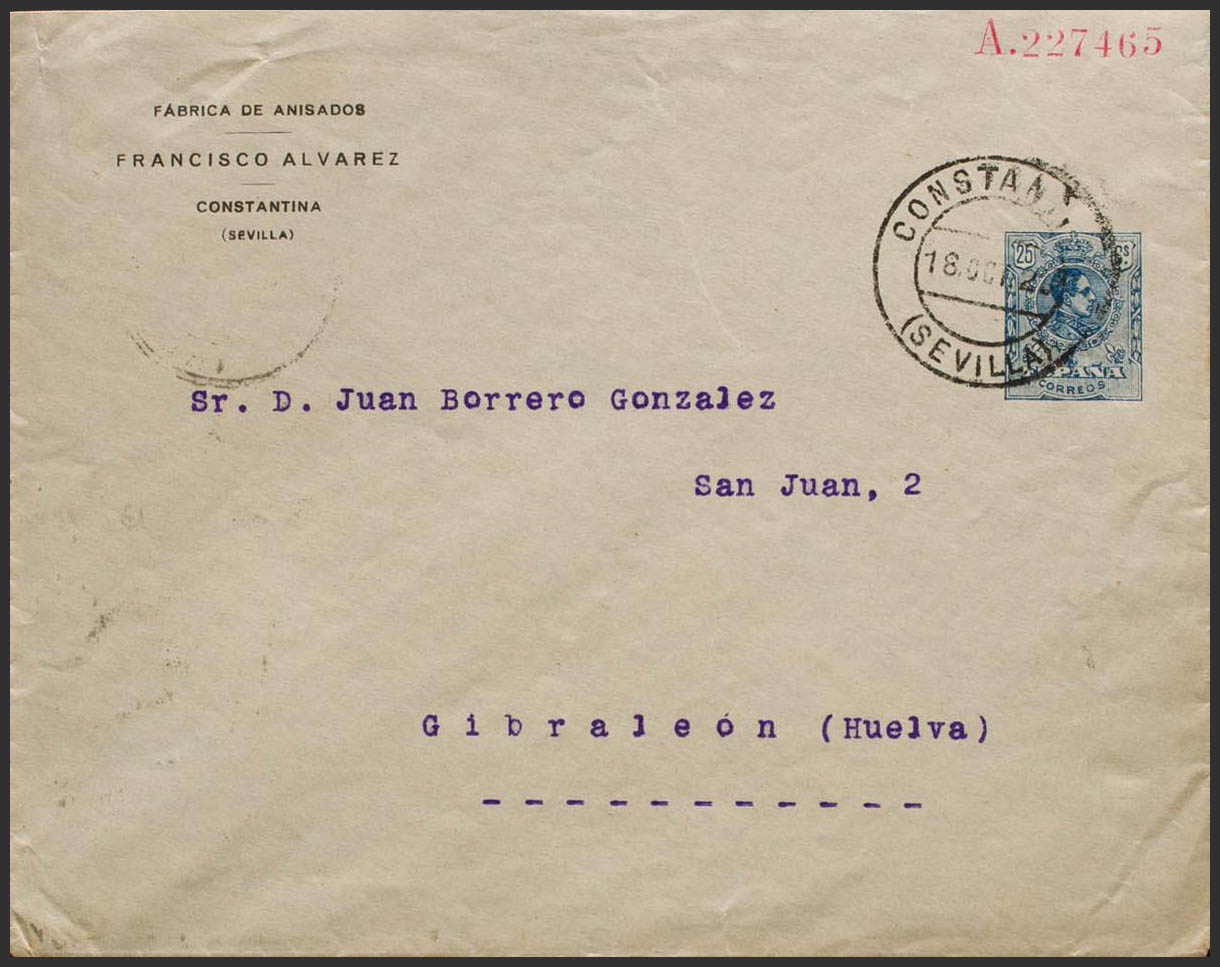 EP323. 1923. 25 cts azul sobre Entero Postal Privado FABRICA DE ANISADOS / FRANCISCO ALVAREZ / CONSTANTINA. CONSTANTINA a GIBRALEON. Al dorso llegada. MAGNIFICO Y RARO. (Láiz 2006: 300 Euros)