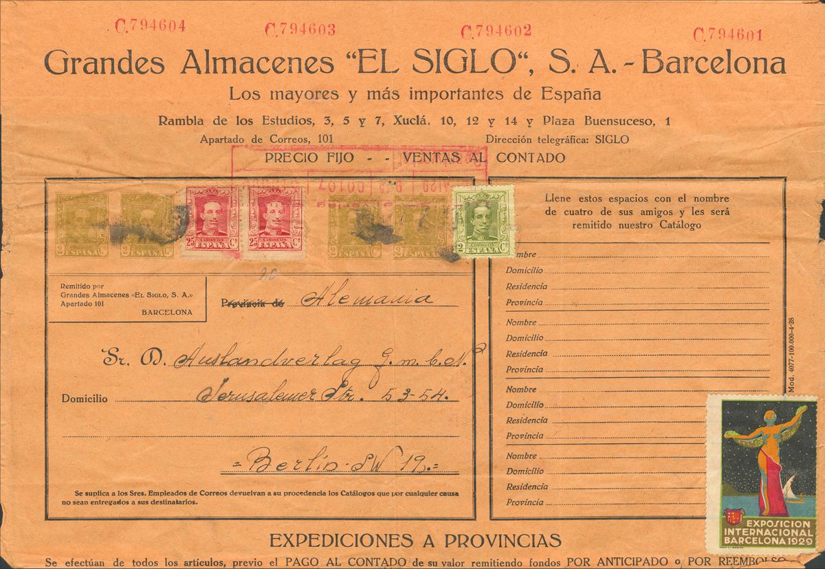 1927. 2 cts verde oliva, cuatro sellos (con sus respectivas cuatro numeraciones diferentes) sobre Faja de distribución de "catálogo de venta" Entero Postal Privado EL SIGLO S.A. de BARCELONA a BERLIN (ALEMANIA), con franqueo complementario de 2 cts y 25 cts, dos sellos. MAGNIFICO Y EXTRAORDINARIAMENTE RARO, NO RESEÑADO EN LA OBRA DE LAIZ Y ES LA PRIMERA VEZ QUE LO VEMOS, SIN DUDA UNA PIEZA DE ENORME INTERES E IMPORTANCIA.