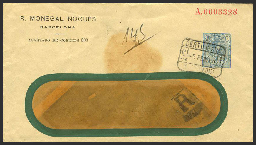 1913. 50 cts azul. Certificado sobre Entero Postal anunciador R. MONEGAL NOGUES, al dorso llegada a Darmstadt. MAGNIFICO Y RARO.