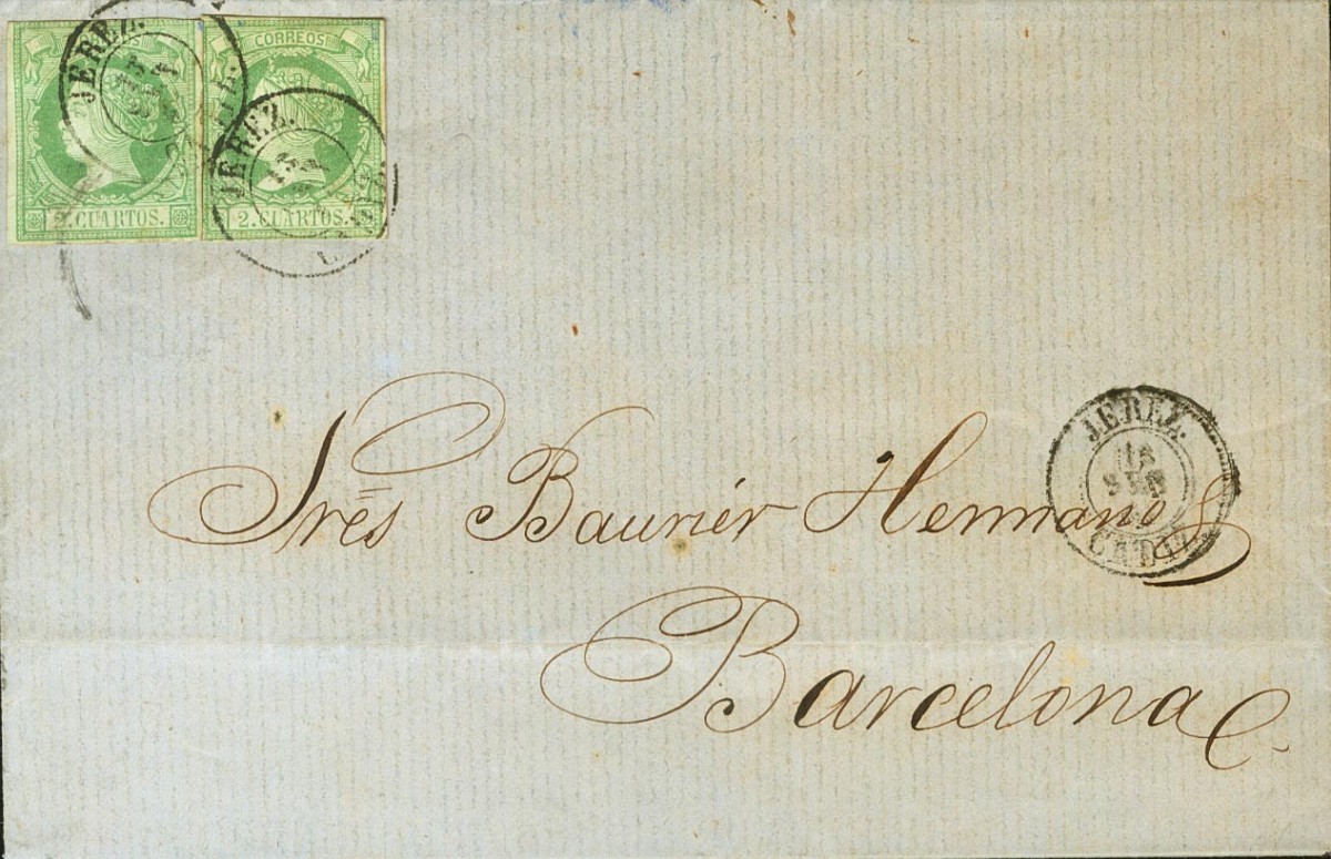 51(2). 1861. 2 cuartos verde, dos sellos. JEREZ a BARCELONA. Matasello JEREZ / CADIZ. RARA COMBINACION PARA COMPONER LOS 4 CUARTOS. MAGNIFICO.