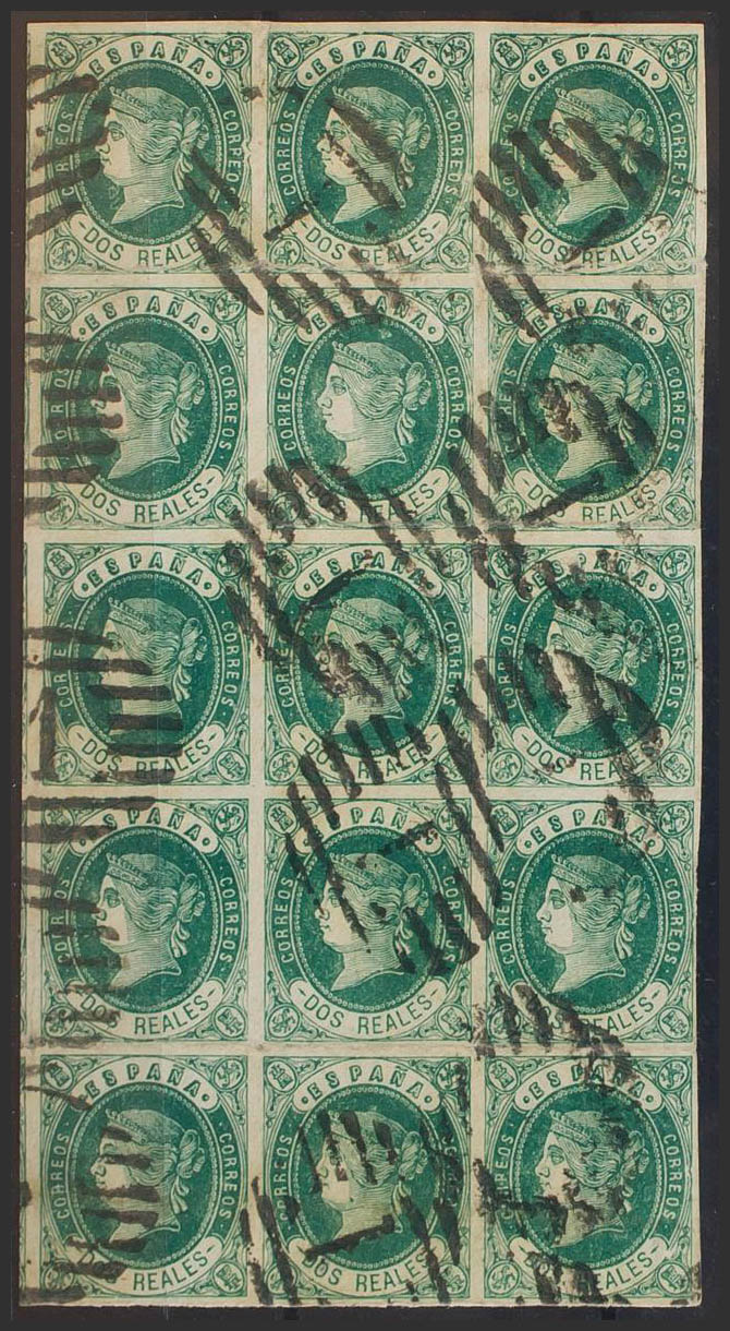 62(15). 1862. 2 reales verde, bloque de quince. Matasello PARRILLA CON Nº1, de Madrid. MAGNIFICO Y RARISIMO, ESPECIALMENTE EN ESTA EXCEPCIONAL CALIDAD.