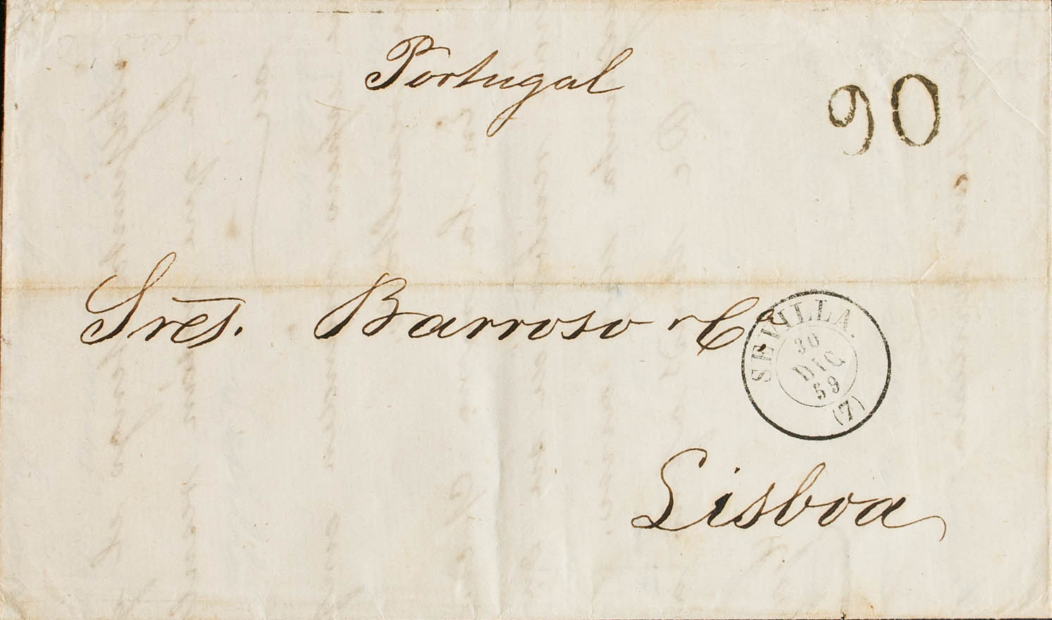 1859. SEVILLA a LISBOA. Fechador SEVILLA / (7) y porteo "90" aplicado en destino, todavía no era necesario el franqueo con sellos a Portugal, al no existir convenio. MAGNIFICA.