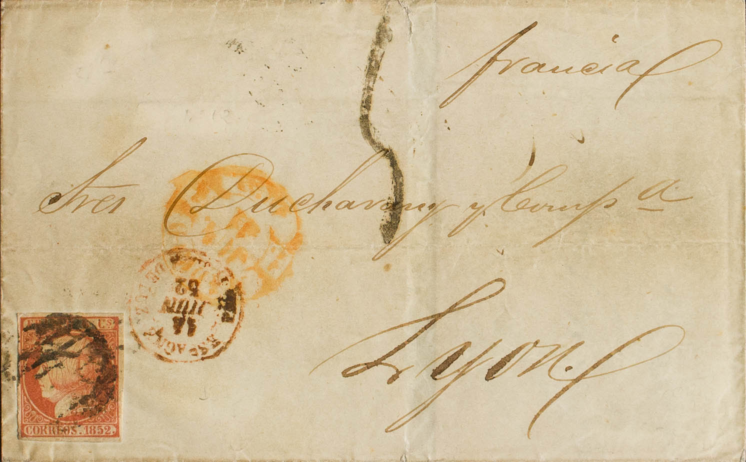 12. 1852. 6 cuartos rosa. MADRID a LYON (FRANCIA). Tasada en Francia con "5" décimas. MAGNIFICA Y RARISIMA CIRCULADA CUANDO NO EXISTIA CONVENIO POSTAL CON FRANCIA.