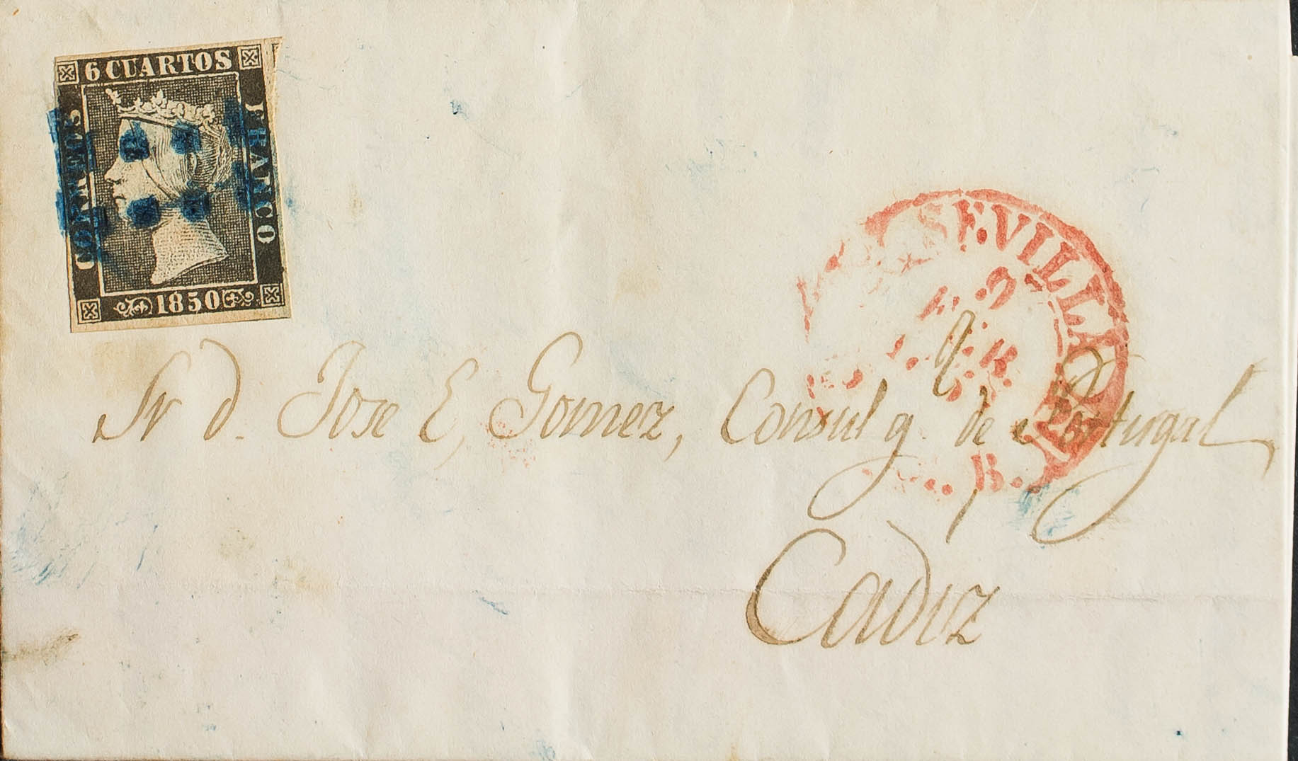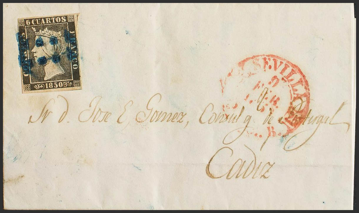 1. 1850. 6 cuartos negro. SEVILLA a CADIZ. Matasello prefilatélico 11 limado, de Sevilla. MAGNIFICA.