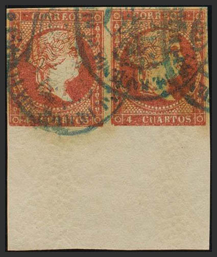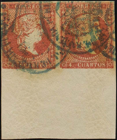 48(2). 1855. 4 cuatos rojo, pareja, borde de hoja. Matasello judicial, en azul. MAGNIFICA.