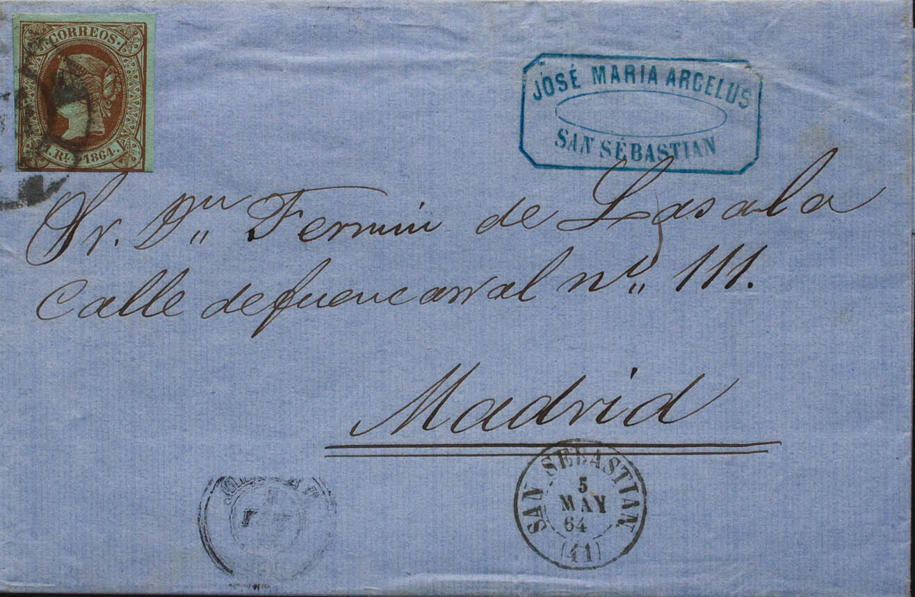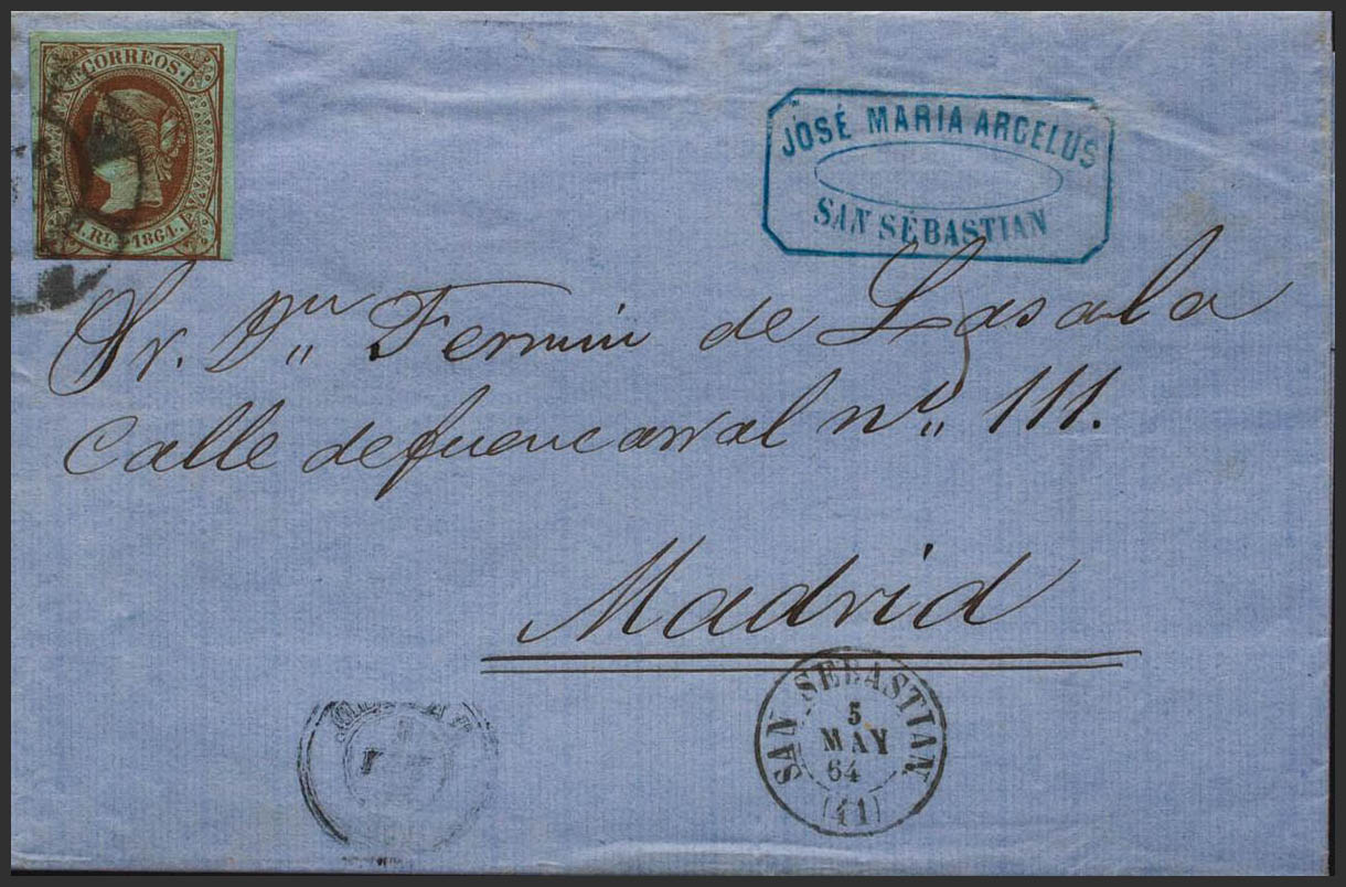 67. 1864. 1 real castaño. SAN SEBASTIAN a MADRID. Franqueo de doble porte con exceso de ½ cuarto. MAGNIFICA Y MUY RARO FRANQUEO.