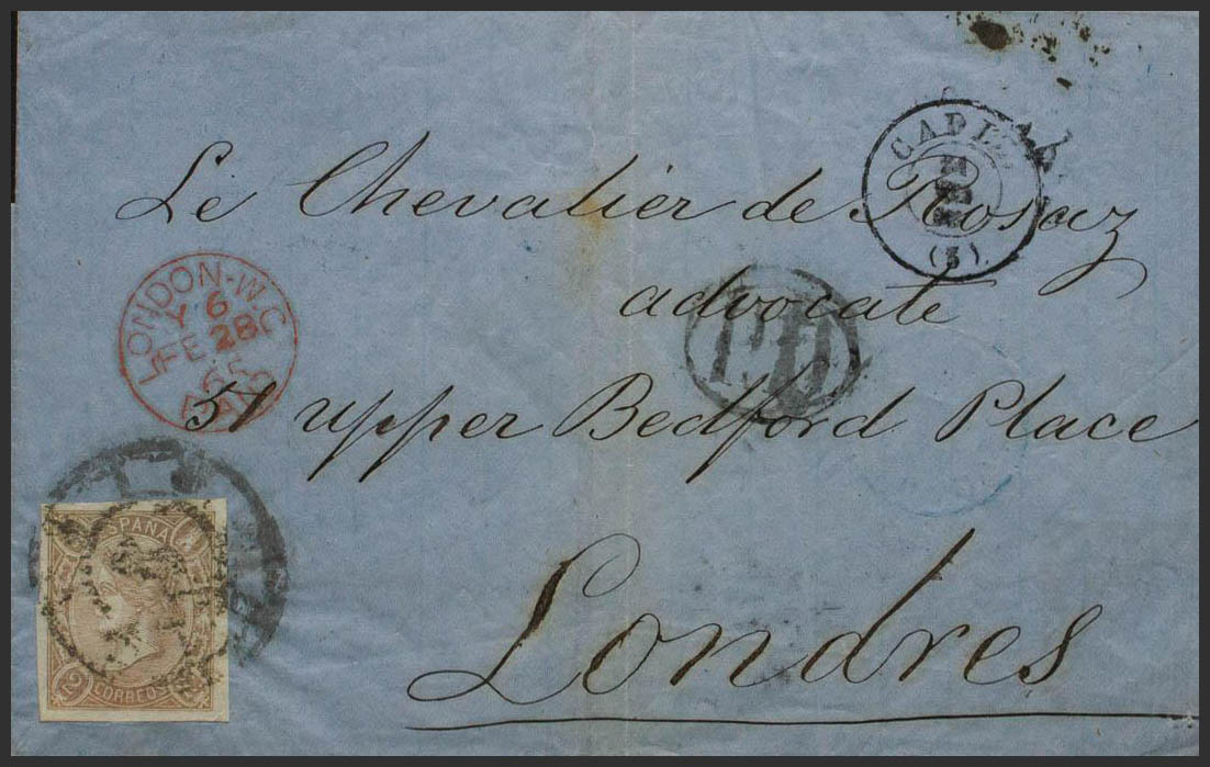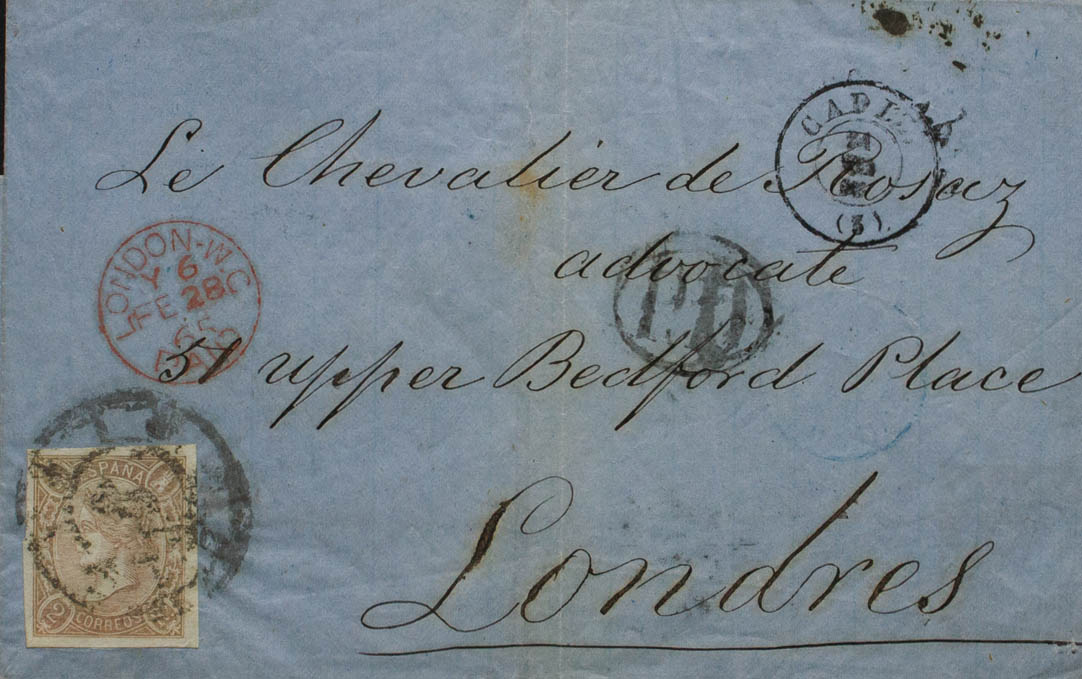 73. 1865. 2 reales lila-gris. CADIZ a LONDRES (INGLATERRA). MAGNIFICA.