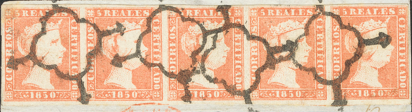 △ 3(5). 1850. 5 reales rojo, tira de cinco, sobre fragmento. Matasello ARAÑA. MAGNIFICA Y MUY RARA. Cert. COMEX. Edifil 2014: +3.285 Euros