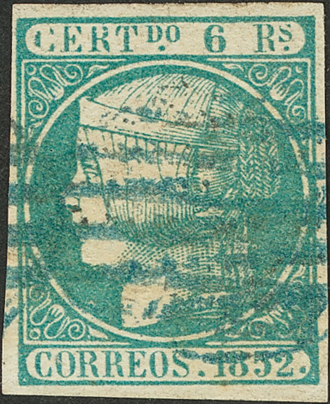 16. 1852. 6 reales azul. Matasello PARRILLA, en azul. MAGNIFICO. Cert. CEM. Edifil 2014: 950 Euros