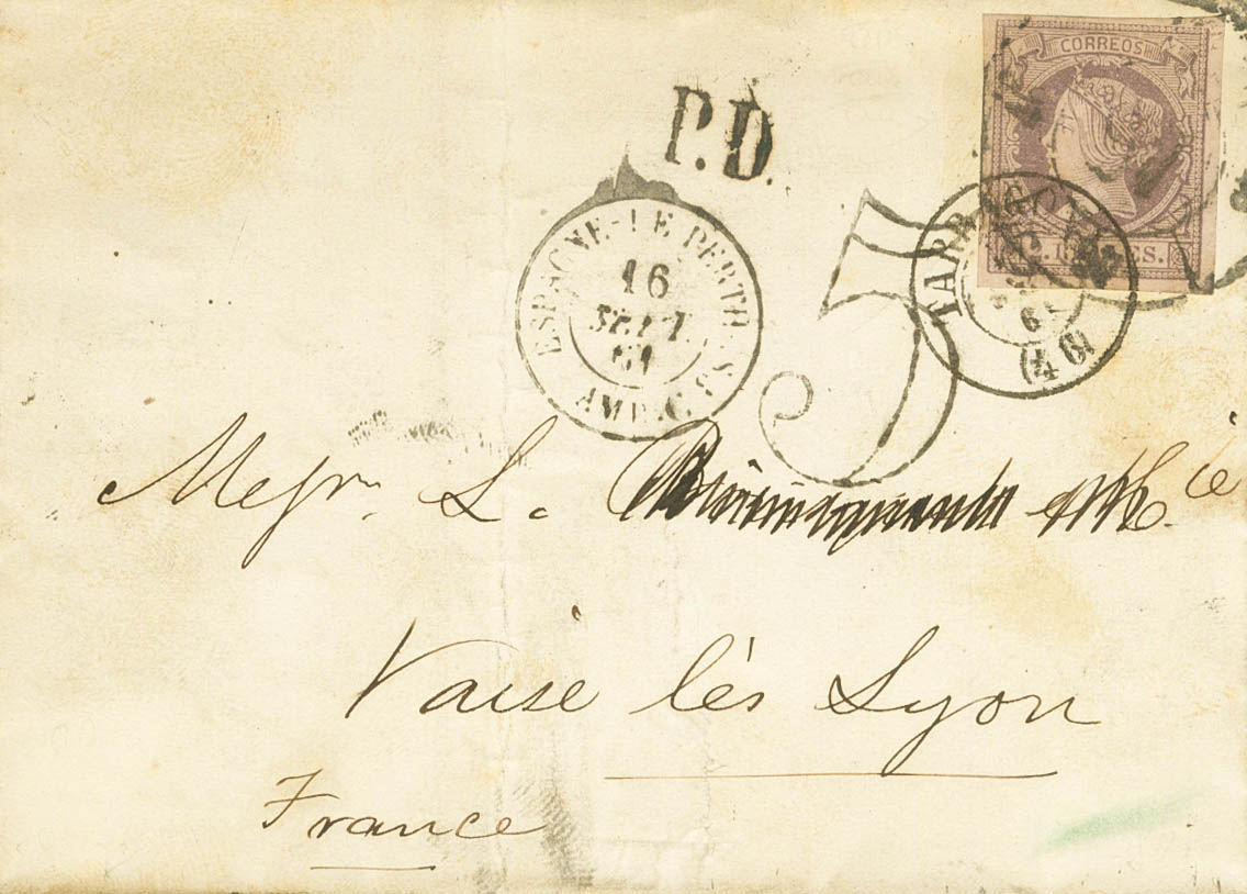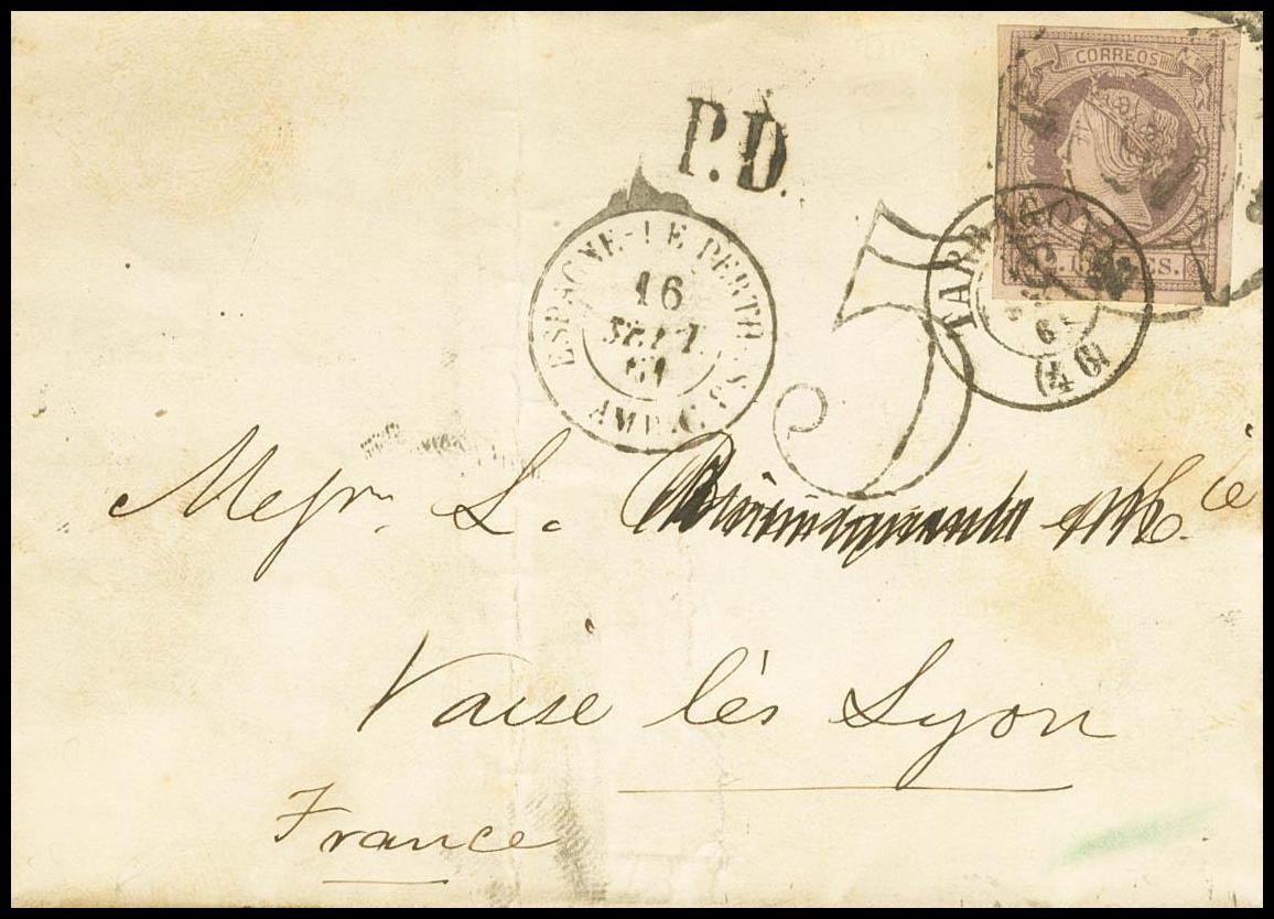 56. 1861. 2 reales lila. TARRAGONA a VAISE LES LYON (FRANCIA). Matasello R.CARRETA Nº46. MAGNIFICA Y RARISIMO USO DE UN SELLO DE 2 REALES A FRANCIA CON EXCESO DE CINCO CUARTOS.