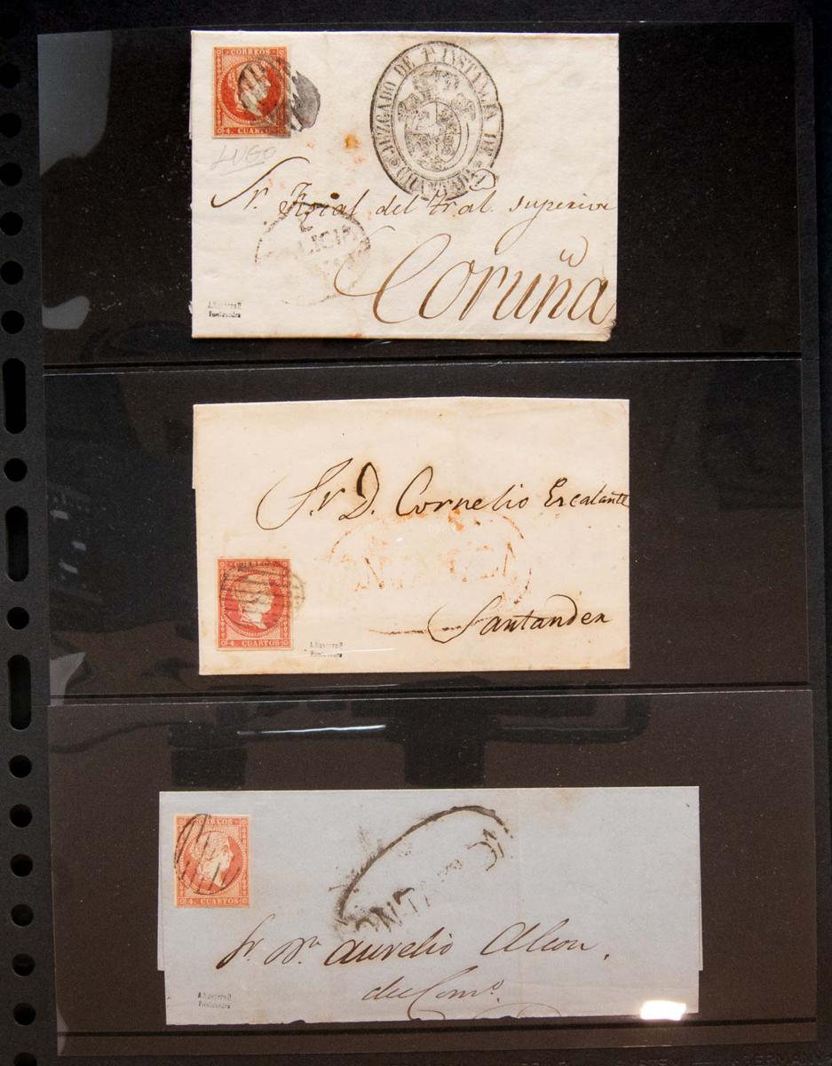 48. (1856ca). Conjunto de ocho cartas, siete frontales y un fragmento franqueadas con el sello del 4 cuartos rojo, todas ellas con marcas prefilatélicas en el frente (acompañantes), alguna muy interesante. A EXAMINAR.