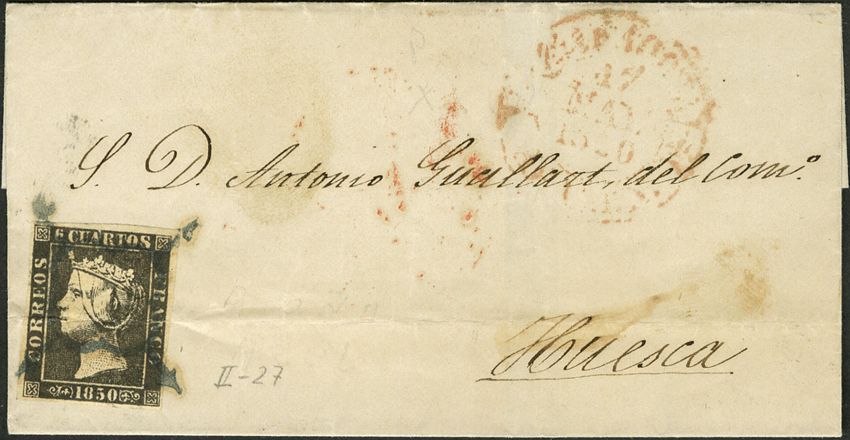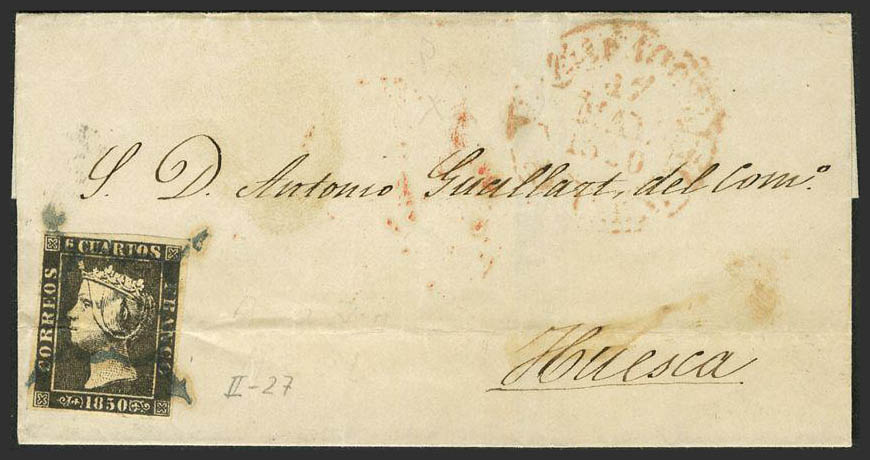 1A. 1850. 6 cuartos negro (II-27). ZARAGOZA a HUESCA. Matasello ARAÑA, en azul. MAGNIFICA Y RARA. Edifil 2005: 315 Euros