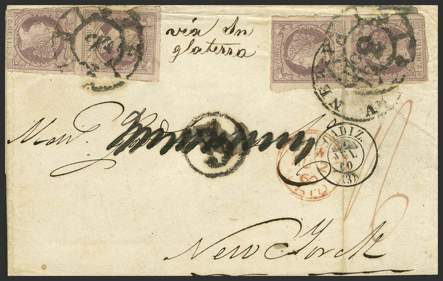 56(4). 1860. 2 reales lilas, dos parejas. CADIZ a NUEVA YORK. Doble porte. MAGNIFICA Y RARA.