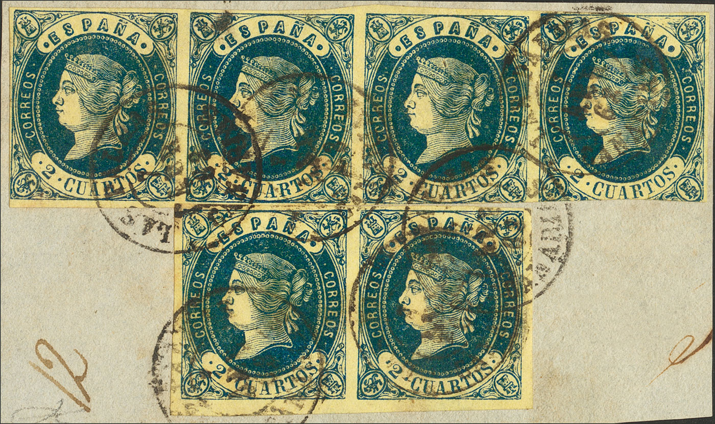△ 57(6). 1862. 2 cuartos azul, seis sellos, sobre fragmento. Matasello LAS PALMAS / CANARIAS. MAGNIFICO Y RARISIMO Y ESPECTACULAR PIEZA DE ENORME CALIDAD.