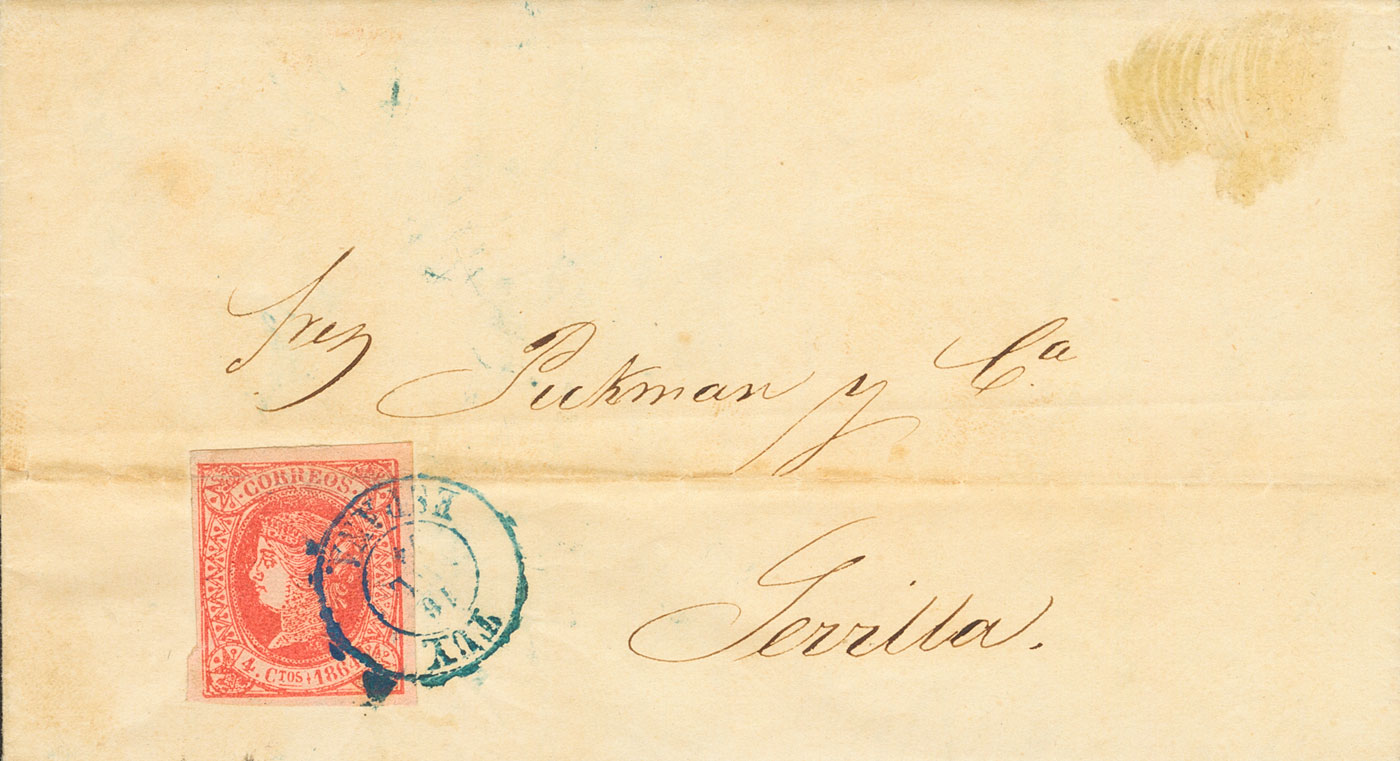 64. 1864. 4 cuartos rojo. TUY (PONTEVEDRA) a SEVILLA. Matasello TUY / PONTEVEDRA, en azul. MAGNIFICA Y PROBABLEMENTE UNICA PIEZA CONOCIDA, SIEMPRE SE UTILIZABA LA RUEDA DE CARRETA COMO MATASELLO, Y EL FECHADOR SIEMPRE EN EL FRENTE DE LA MISIVA, ESTA ES LA UNICA CARTA QUE CONOCEMOS SIRVIENDO EL FECHADOR COMO MATASELLO, CON LA PARTICULARIDAD ADEMAS DEL COLOR AZUL DEL MATASELLO.