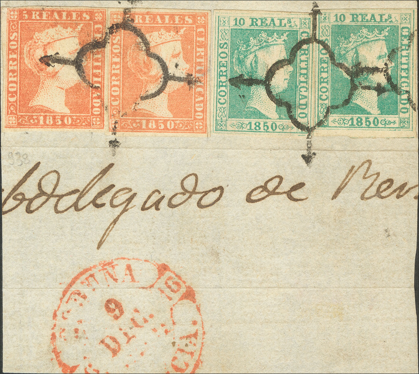 △ 3(2), 5(2). 1850. 5 reales rojo, dos sellos y 10 reales verde, dos sellos, sobre fragmento. Matasello ARAÑA y al lado baeza CORUÑA / GALICIA. MAGNIFICA Y EXTREMADAMENTE RARA COMBINACION, PIEZA ESPECTACULAR Y DE ENORME IMPORTANCIA. Cert. CEM.
