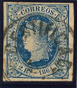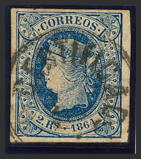 68. 1864. 2 reales azul. Matasello CERTIFICADO. MAGNIFICO Y MUY RARO.