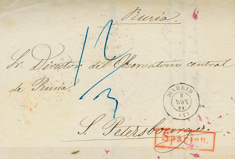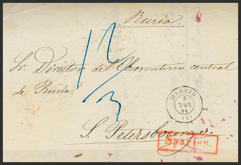 (1861). MADRID a SAN PETERSBURGO (RUSIA). En el frente marca SPANIEN, en rojo y tasada 12/3. MAGNIFICO Y RARISIMO DESTINO.