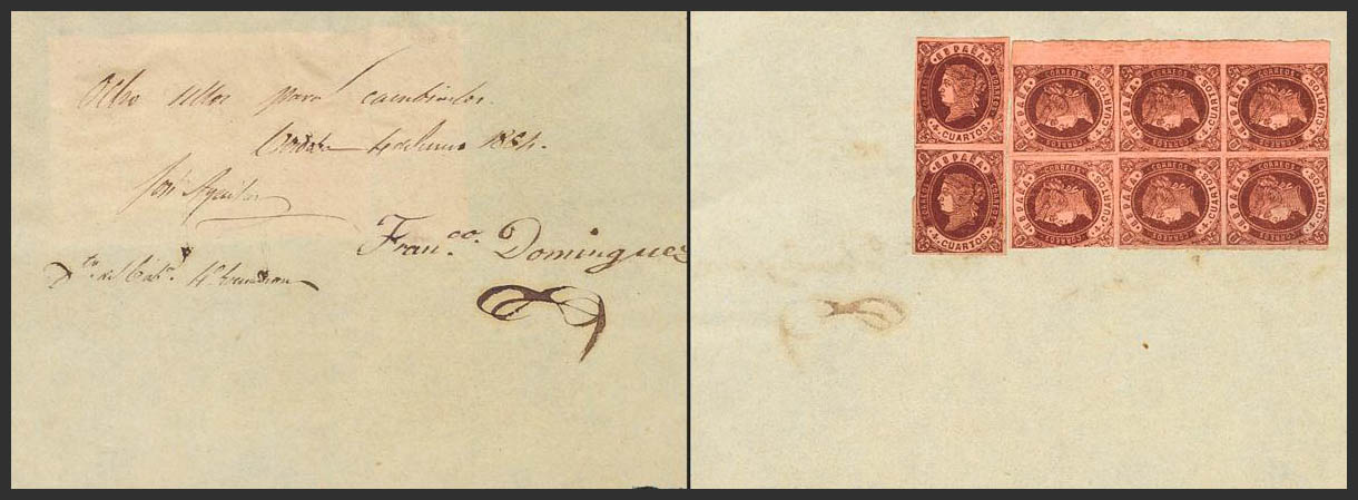 △ 58(8). 1862. 4 cuartos castaño, ocho sellos sobre Documento de Canje con firma y fecha, al dorso. MAGNIFICO Y MUY RARO.