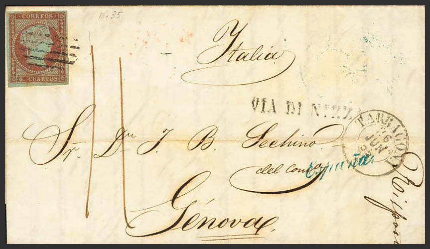 40. 1855. 4 cuartos rojo. TARRAGONA a GENOVA (ITALIA). MAGNIFICA Y RARISIMA, AL NO EXISTIR CONVENIO POSTAL CON ITALIA.