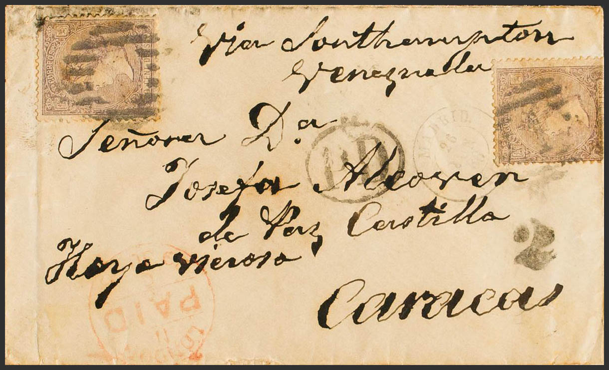 85(2). 1866. 20 cts lila, dos sellos. MADRID a CARACAS. MAGNIFICO Y MUY RARO DESTINO.