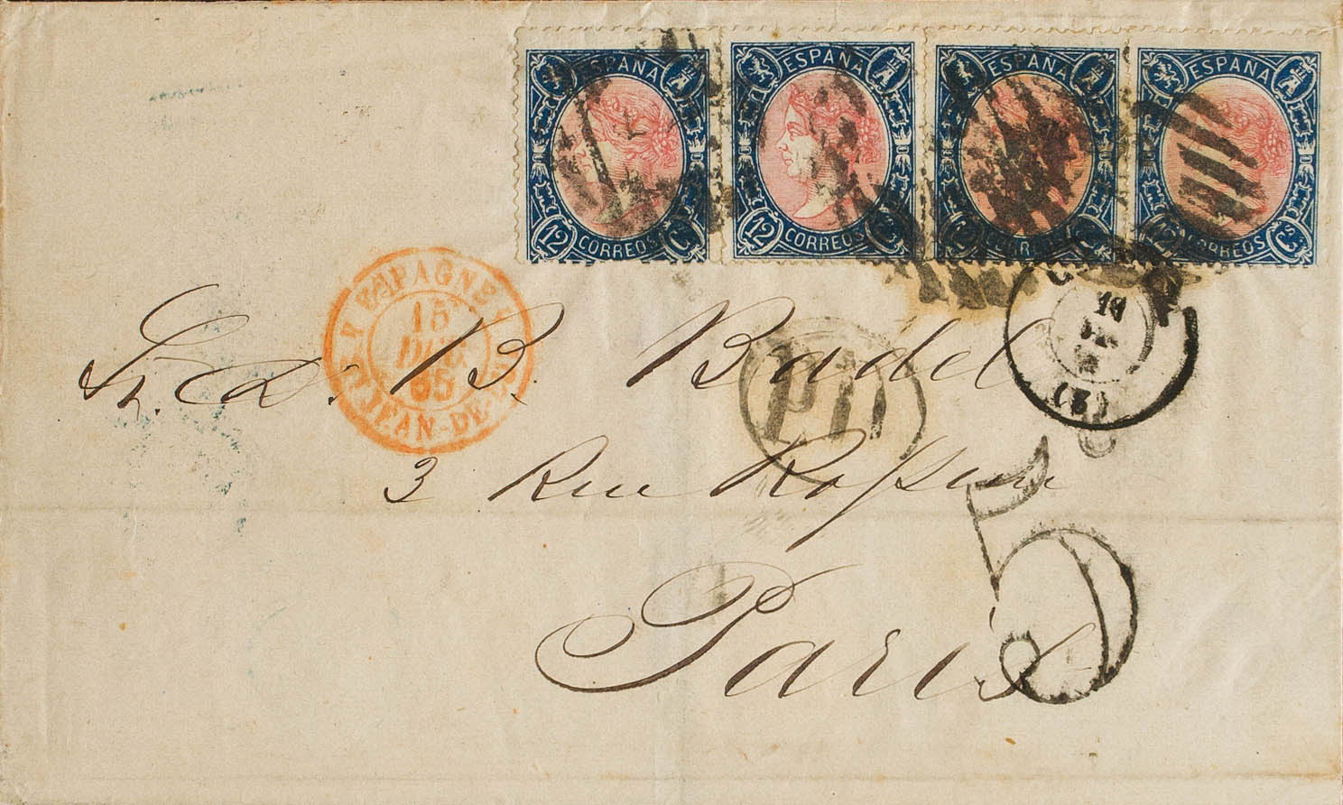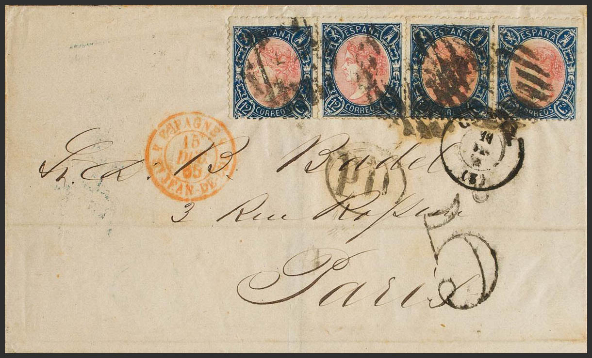 76(4). 1865. 12 cuartos azul y rosa, cuatro sellos. CADIZ a PARIS. MAGNIFICA Y RARO FRANQUEO DE CUATRO PORTES.