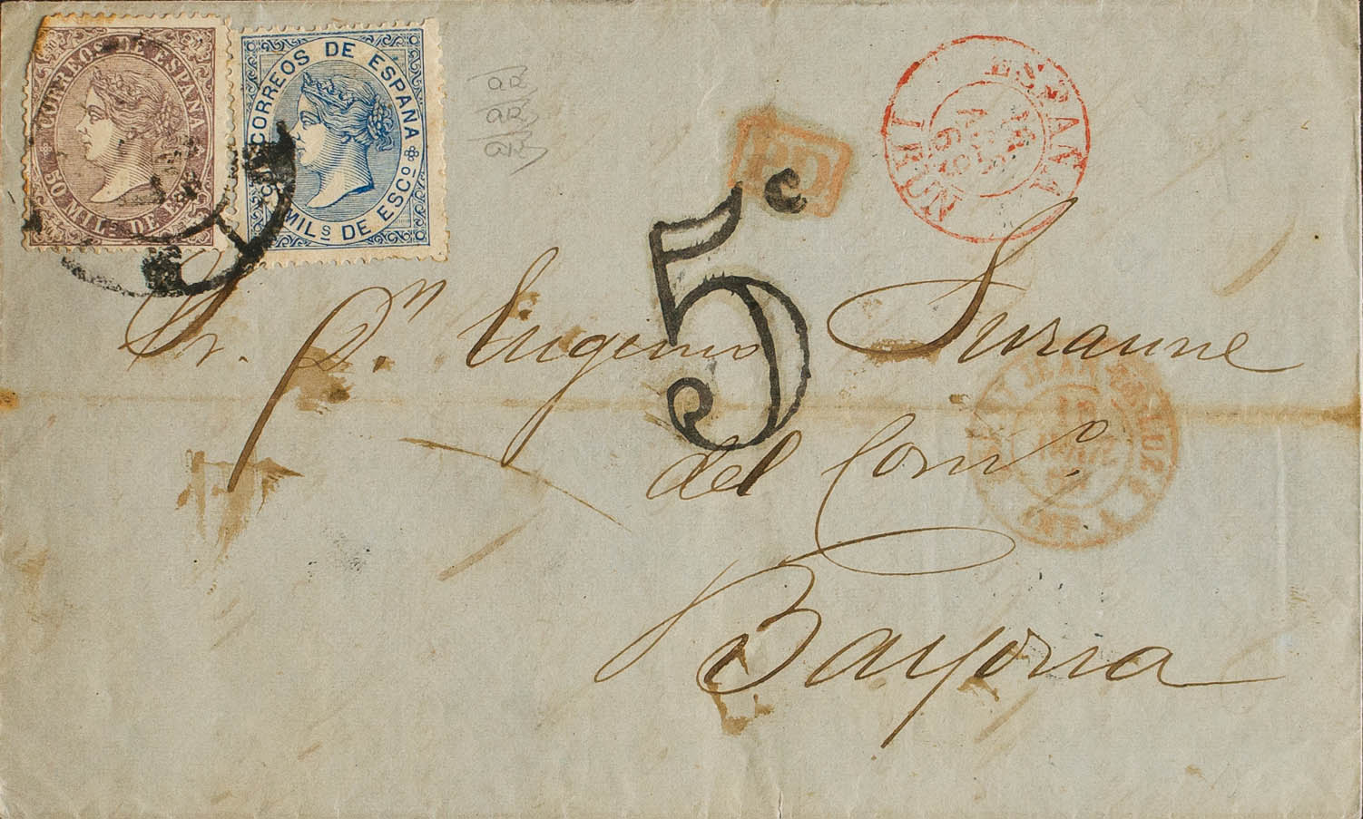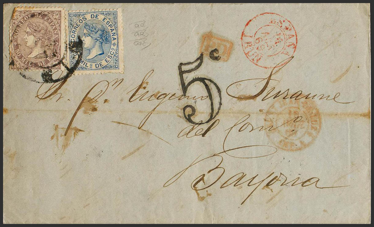 97, 98. 1868. 25 mils azul y 50 mils violeta (pequeño defecto). IRUN a BAYONA (FRANCIA). Matasello R.CARRETA Nº50. BONITO Y RARO FRANQUEO FRONTERIZO.