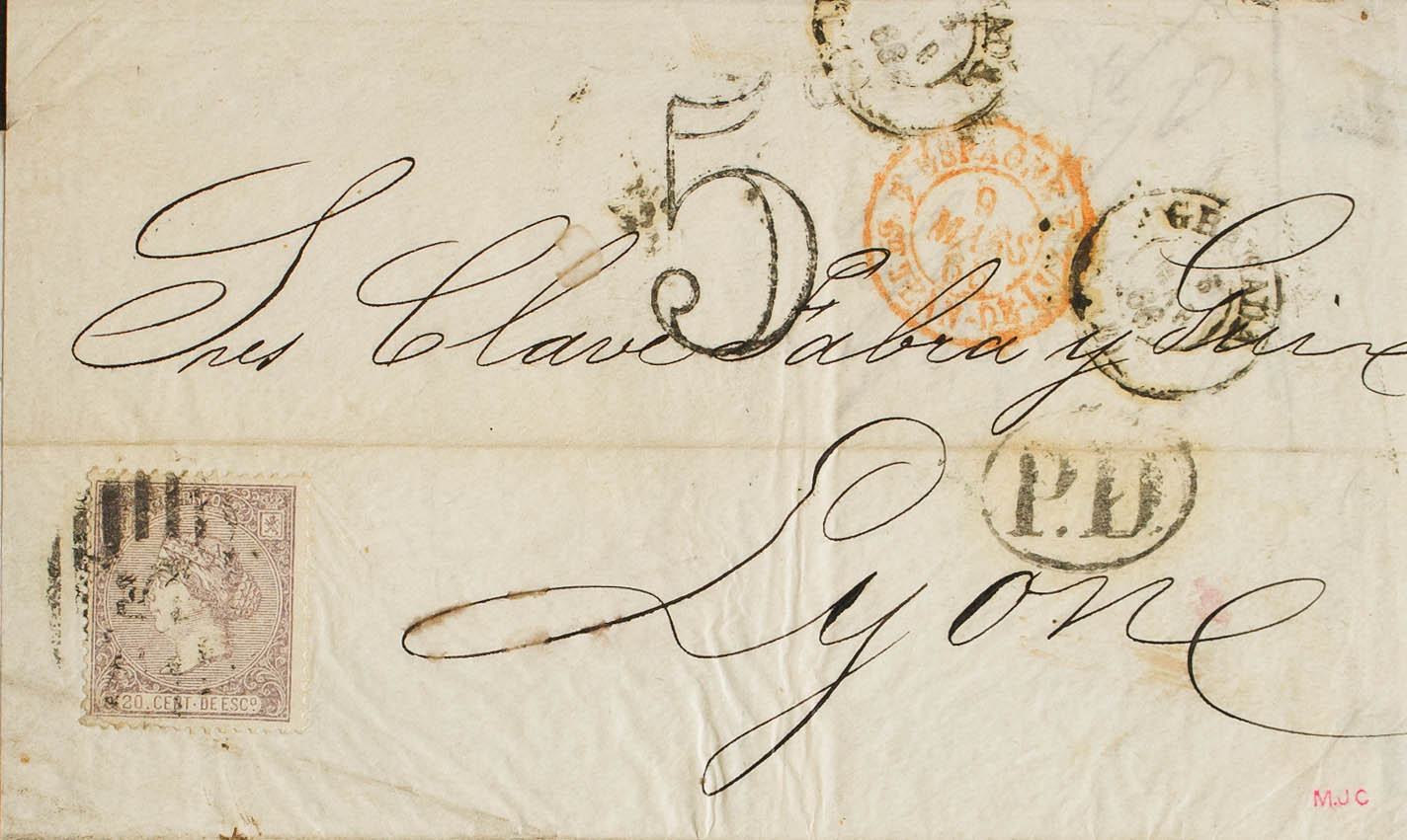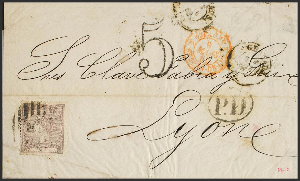 85. 1866. 20 cts lila. GRANADA a LYON (FRANCIA). MAGNIFICA Y RARISIMO USO DEL SELLO DE 20 CTS COMO FRANQUEO SUSTITUTORIO DE 12 CUARTOS Y OBVIAMENTE CON EXCESO DE 5 CUARTOS.