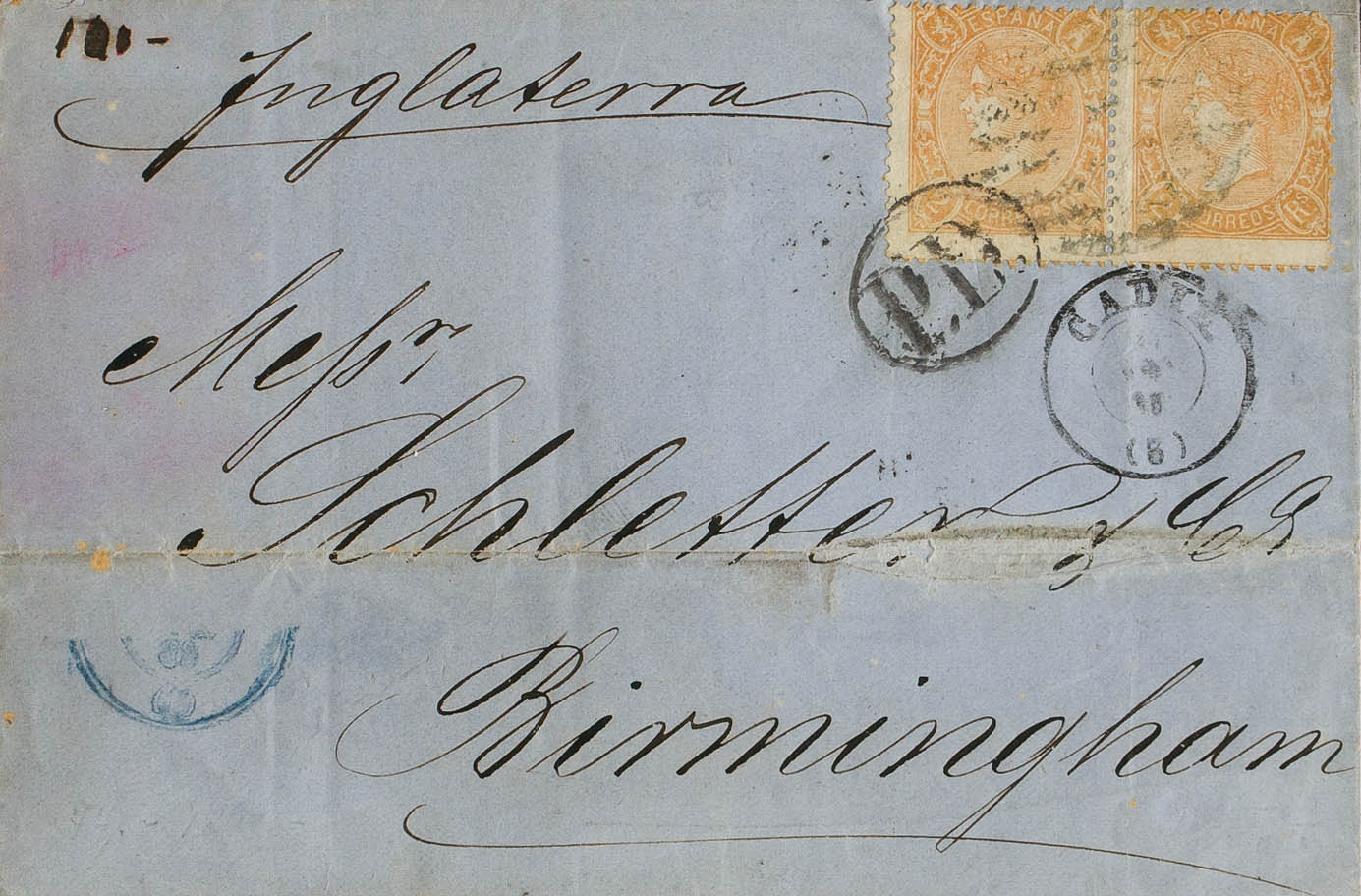 79A(2). 1865. 2 reales naranja, pareja. CADIZ a BIRMINGHAM (INGLATERRA). Franqueo de doble porte. MAGNIFICA Y RARA, ESPECIALMENTE EN LA EMISION DENTADA.