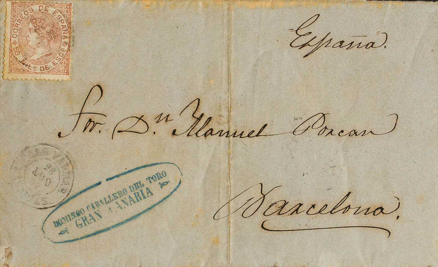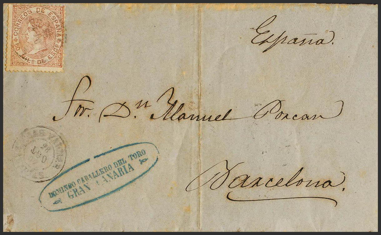 96. 1867. 50 mils castaño claro. LAS PALMAS DE GRAN CANARIA a BARCELONA. Matasello LAS PALMAS / CANARIAS. MAGNIFICA E INUSUAL, ESPECIALMENTE ACOMPAÑADA CON UNA MARCA COMERCIAL DE ORIGEN PRIVADO.