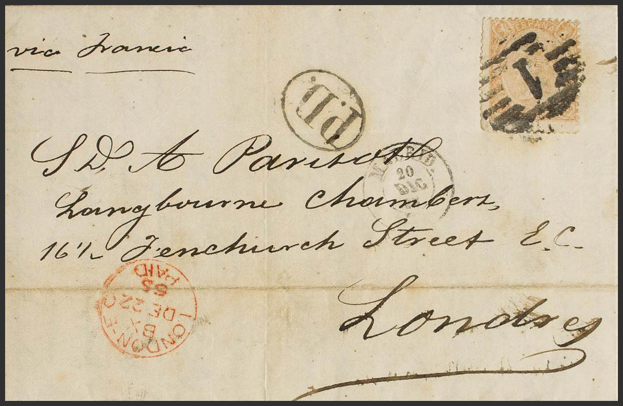 79A. 1865. 2 reales naranja. MADRID a LONDRES (INGLATERRA). BONITA Y MUY RARA EN LA EMISION DENTADA.