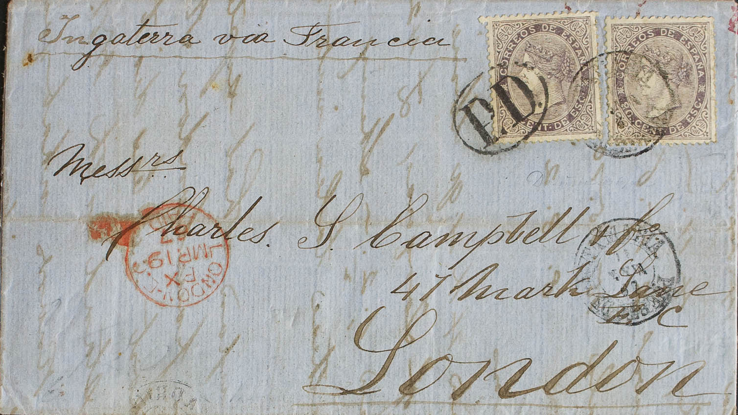 92(2). 1867. 20 cts lila oscuro, dos sellos. PUERTO DE SANTA MARIA a LONDRES (INGLATERRA). MAGNIFICA Y RARO DOBLE PORTE.