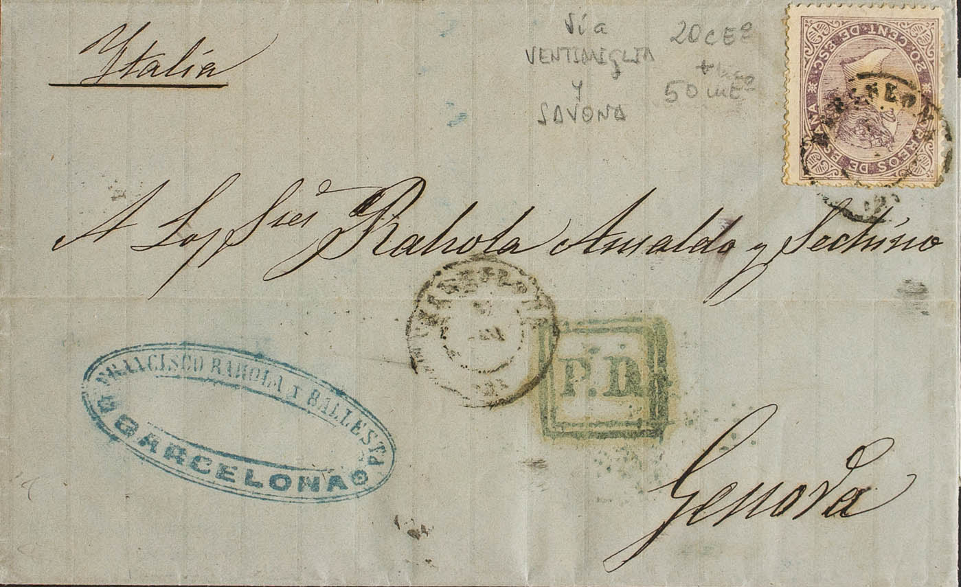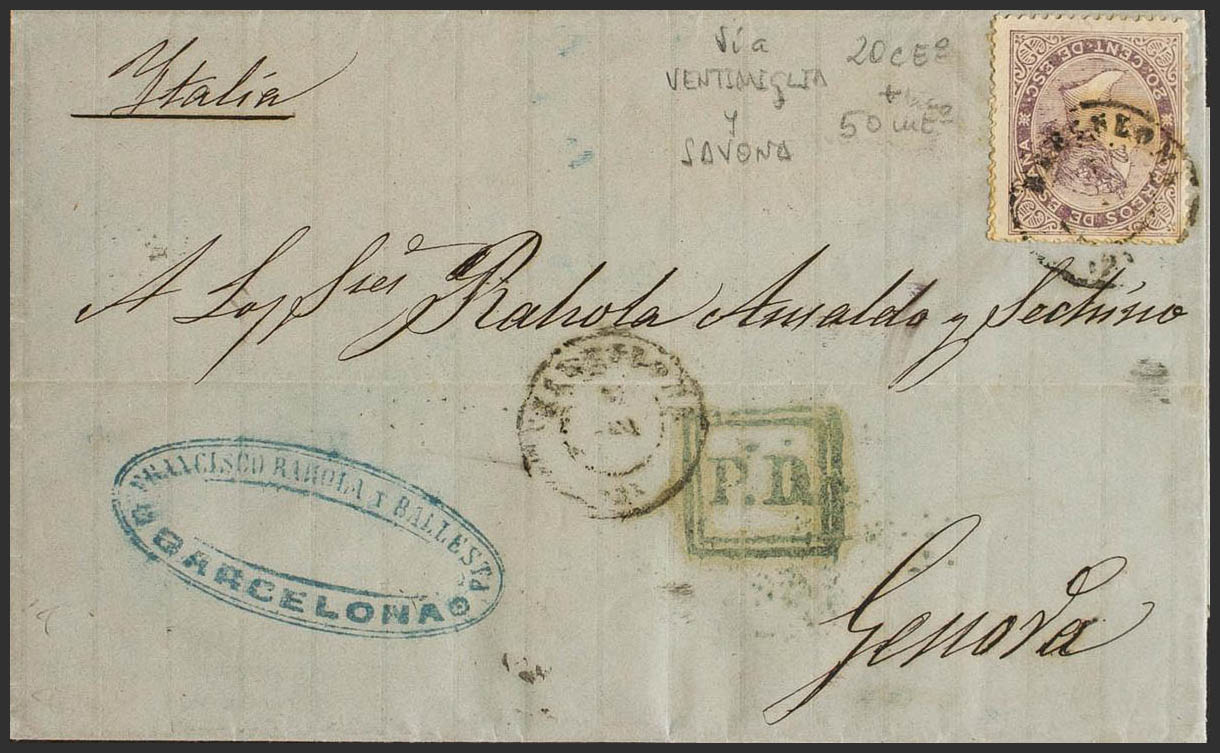 92. 1868. 20 cts lila y 50 mils (hay un sello de 50 mils ocultado por el sello de 20 cts). BARCELONA a GENOVA (ITALIA). El sello de 50 mils no es válido para Italia y se aplica el sello correcto de 20 cts (equivalente a las 200 mils de la tarifa a Italia). MAGNIFICA Y RARISIMA, PROBABLEMENTE UNICA CONOCIDA.