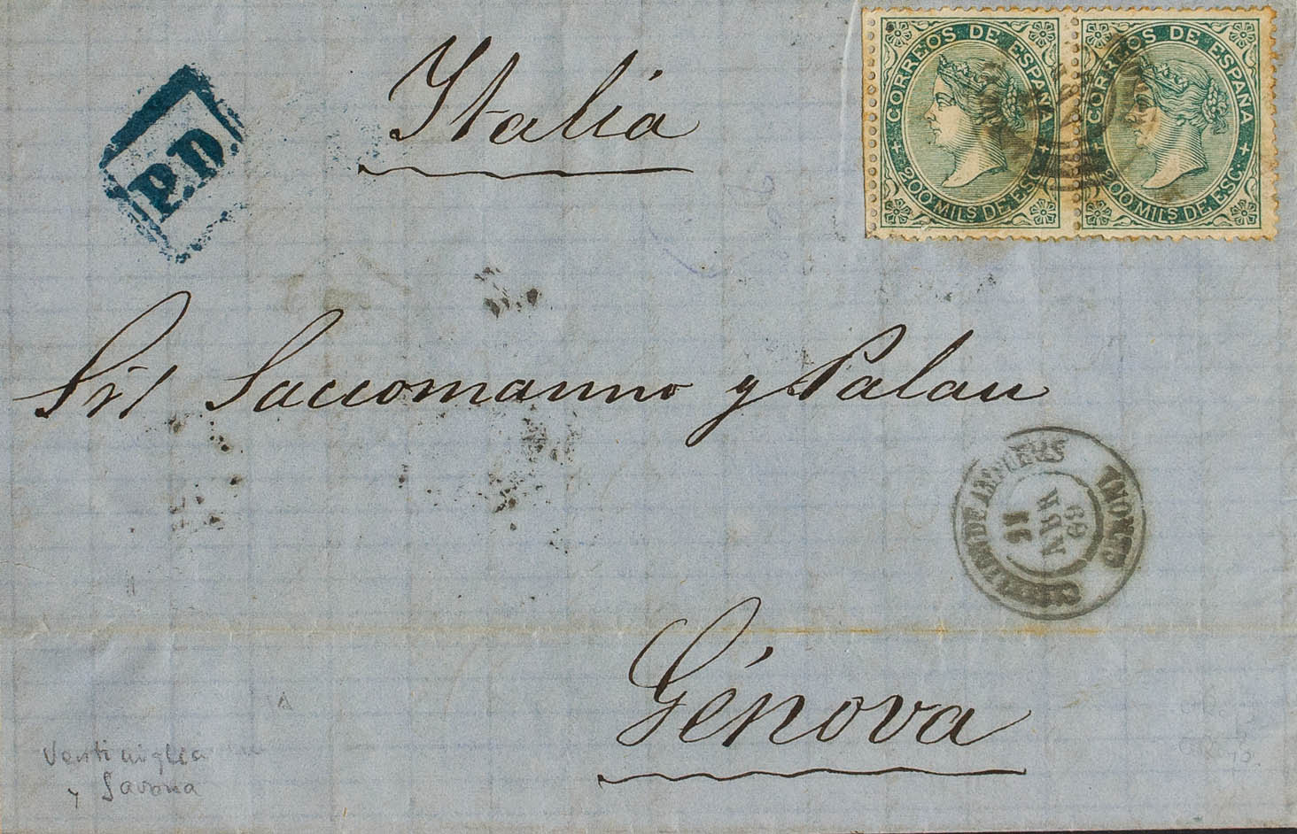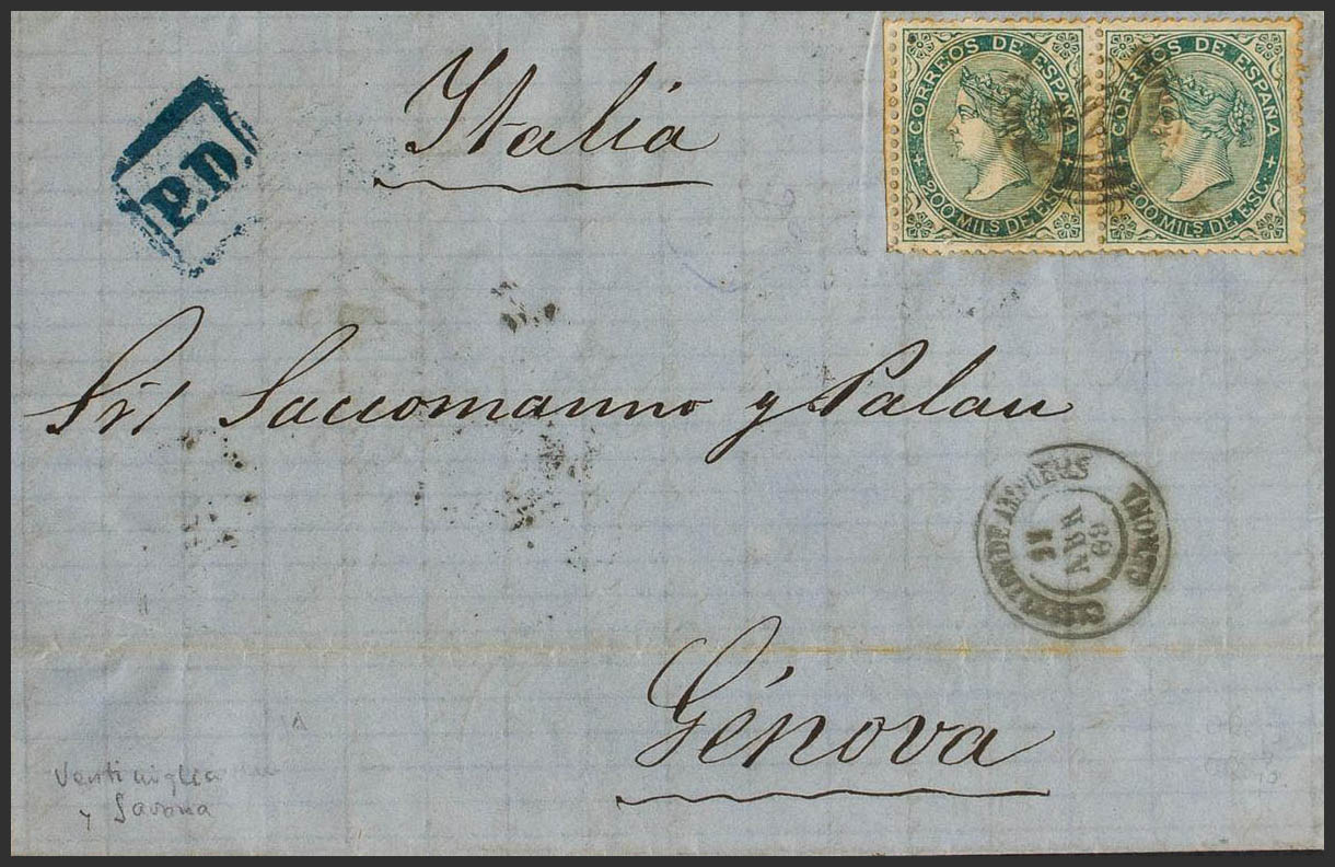 100(2). 1869. 200 mils verde, pareja. CASTELLON DE AMPURIAS a GENOVA (ITALIA). Matasello CASTELLON DE AMPURIAS / GERONA. MAGNIFICA Y RARO DOBLE PORTE A ITALIA.