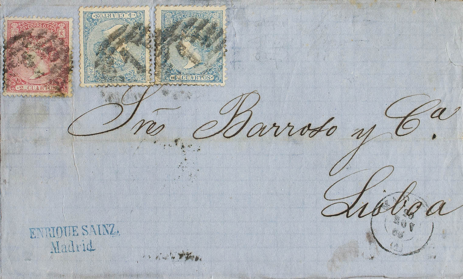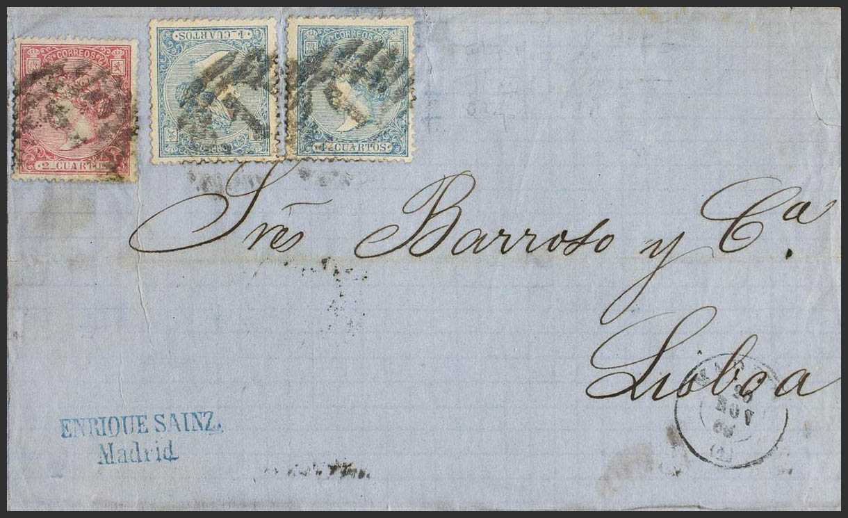 80, 81(2). 1866. 2 cuartos rosa y 4 cuartos azul, dos sellos. MADRID a LISBOA (PORTUGAL). MAGNIFICA E INUSUAL COMBINACION, CON EXCESO DE FRANQUEO DE 4 CUARTOS, PARA COMPLETAR LA TARIFA DE 6 CUARTOS A PORTUGAL.